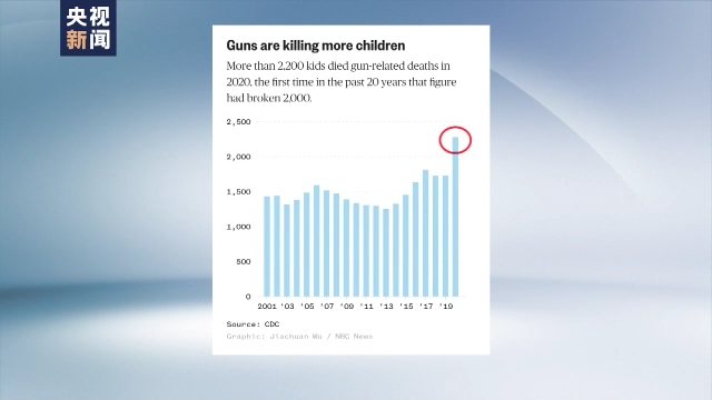美国疾病控制和预防中心的数据显示,2020年,死于枪击事件的儿童人数超过2200人,这是过去20年内,这一数字首次突破2000,超过了车祸、疾病等原因导致的儿童死亡人数。