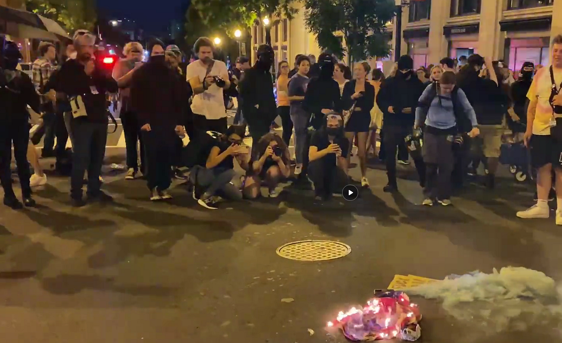 6月24日晚,美国堕胎权支持者在华盛顿当街烧国旗。(社交平台)