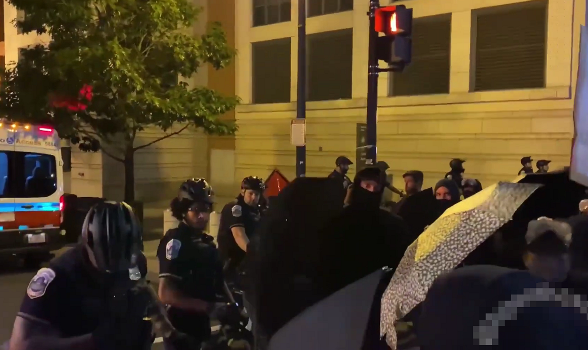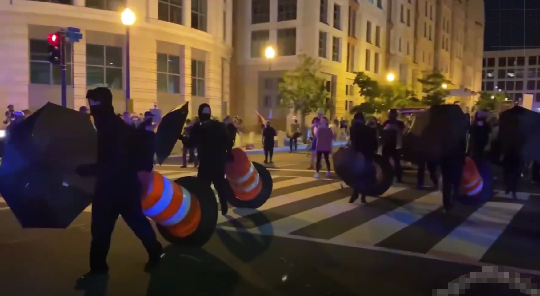 美国华盛顿街头,黑衣人冲破警察设置的防线。(社交平台)