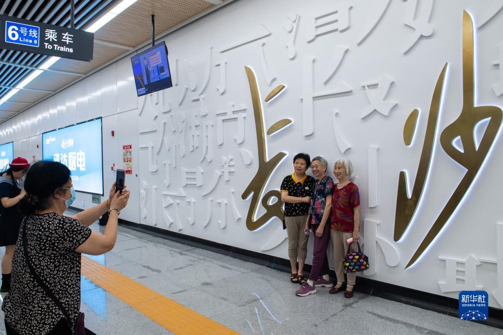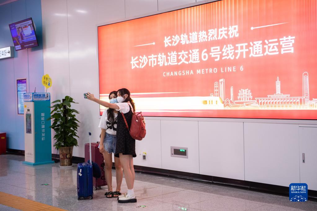 6月28日,在长沙文昌阁地铁站,市民合影庆祝长沙地铁6号线开通运营。