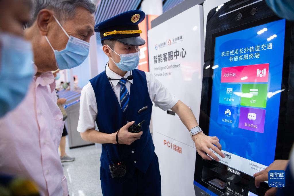 6月28日,在长沙黄花机场T1T2地铁站,工作人员(右)操作智能设备为市民查询客票信息。