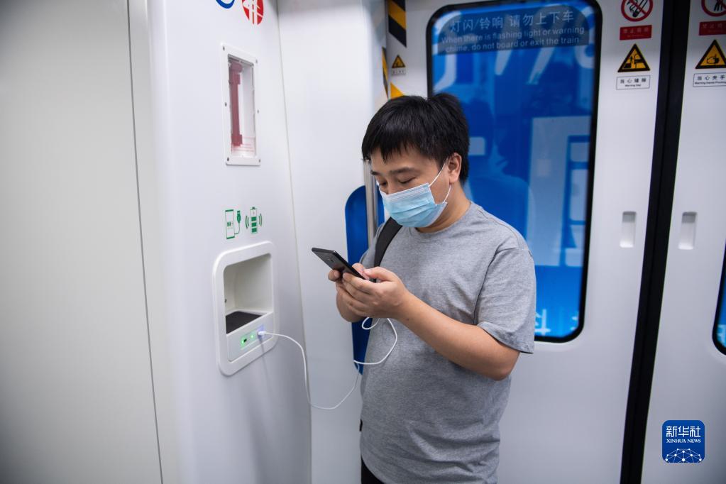 6月28日,在长沙地铁6号线上,市民通过车载充电装置为手机充电。