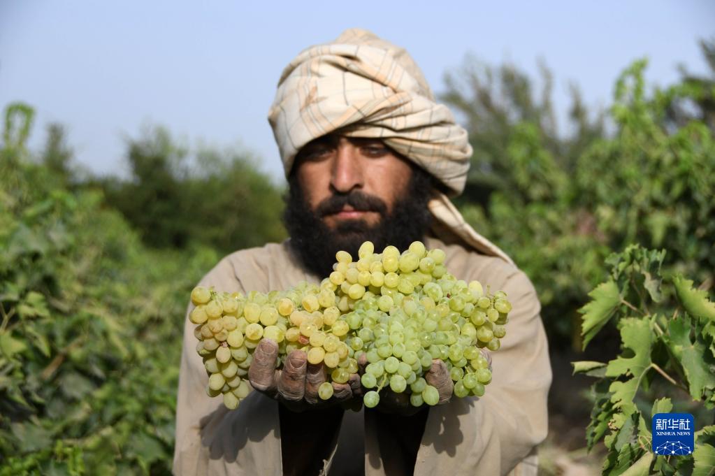 7月2日,农民在阿富汗坎大哈省扎里地区展示摘下的葡萄。