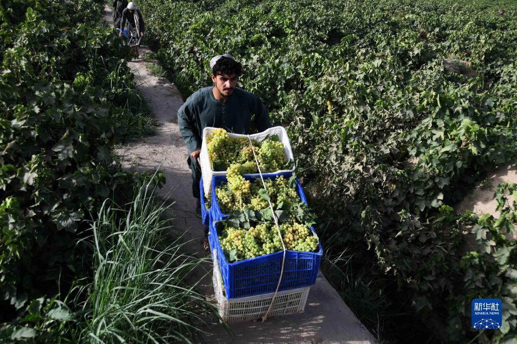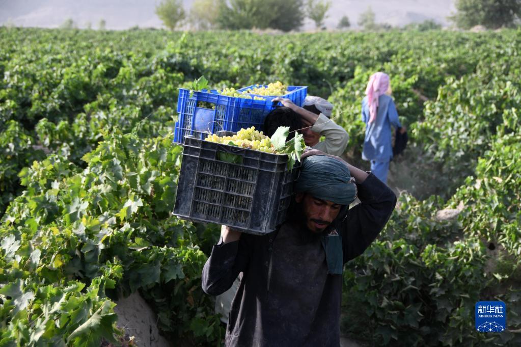 7月2日,农民在阿富汗坎大哈省扎里地区搬运摘下的葡萄。