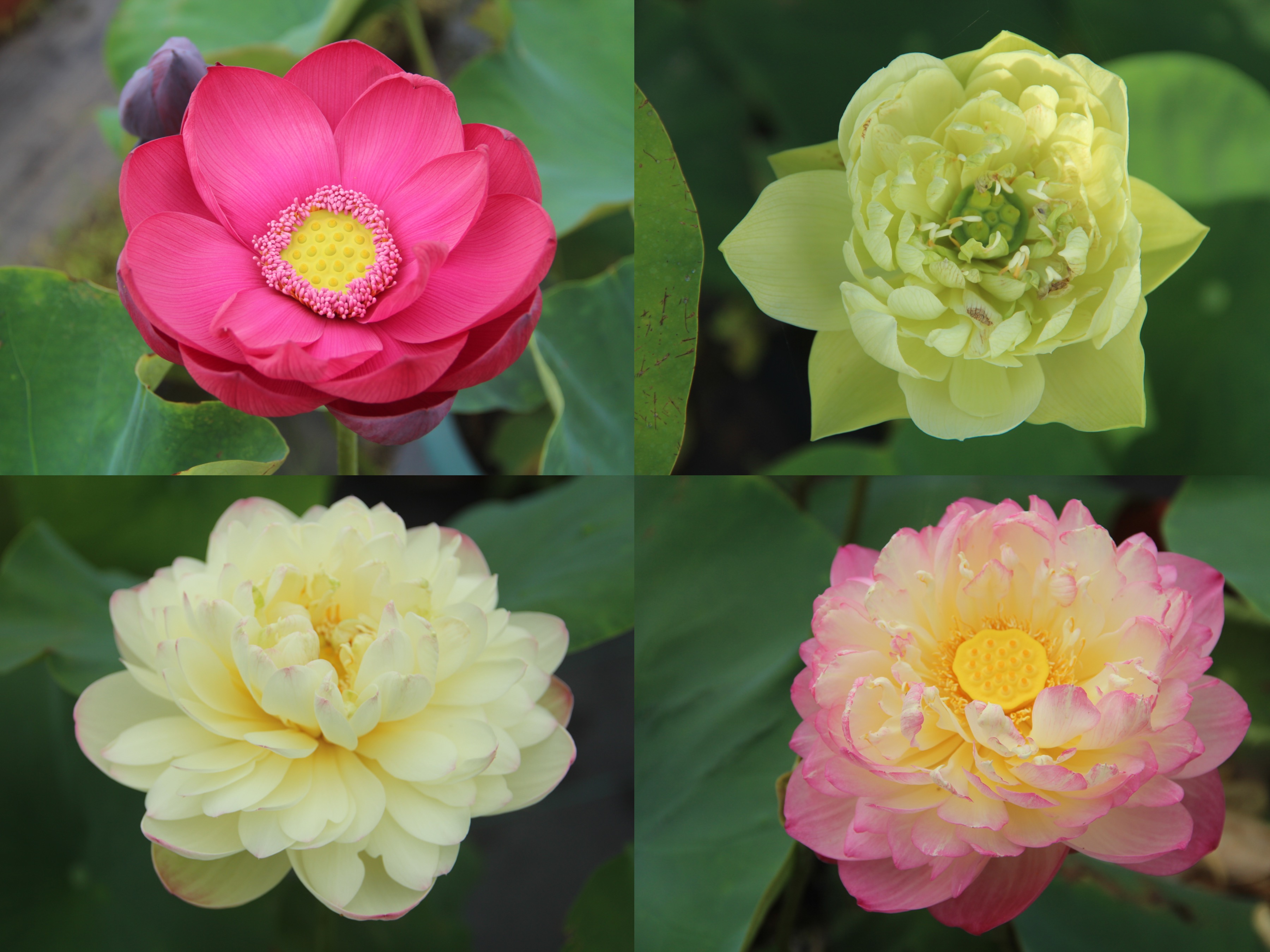 新浜荷花基地近年育种成果:(左上)2021年新培育的红花红蕊的荷花;(左下)黄色花瓣镶嵌红色晕边,重瓣荷花;(右上)花博会期间新浜基地送给古猗园的猗青莲;(右下)品名“惊艳”颜色层次感强 。 田礼志 图