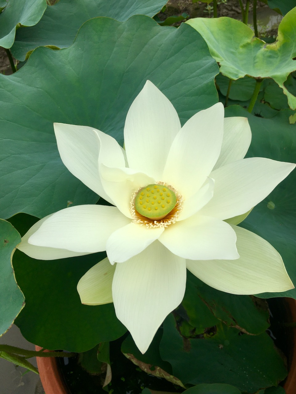 在盆栽中种植的白莲花,莲蓬为绿色 田礼志 图