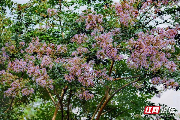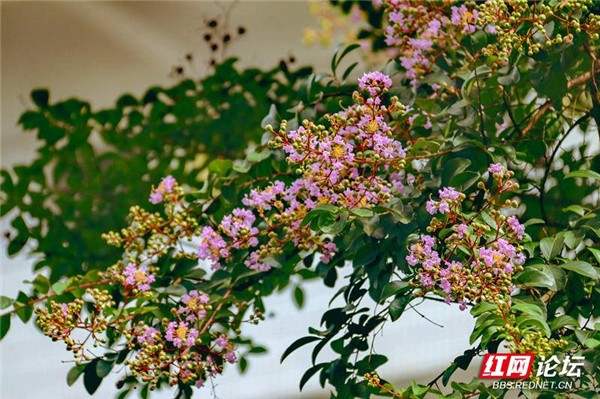 风吹树摇,花潮涌动。紫薇花在盛夏里迎接晨光,点缀在绿叶之间,摇摆在清风之中,闪而不落,亮而不透,含蓄朦胧,令人怦然心动。