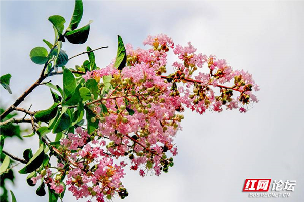 只见紫薇花缀满枝头,一朵朵、一簇簇地朝上绽放,在阳光的映衬下呈现出一片姹紫嫣红的立体花景,美得让人移不开眼。
