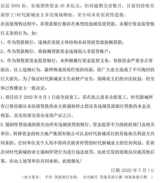 据每经房产的消息,近日在网络热传的“武汉时代新城全体业主强制停贷告知书”(以下简称告知书)显示,“武汉市汉南时代新城项目逾期交房数月,业主多次现场维权仍无实质进展,数千户业主(已售房源且未结清贷款)决定,若该项目在限定时间(2022年8月1日)内仍未全面复工,业主将强制停还银行月供。”