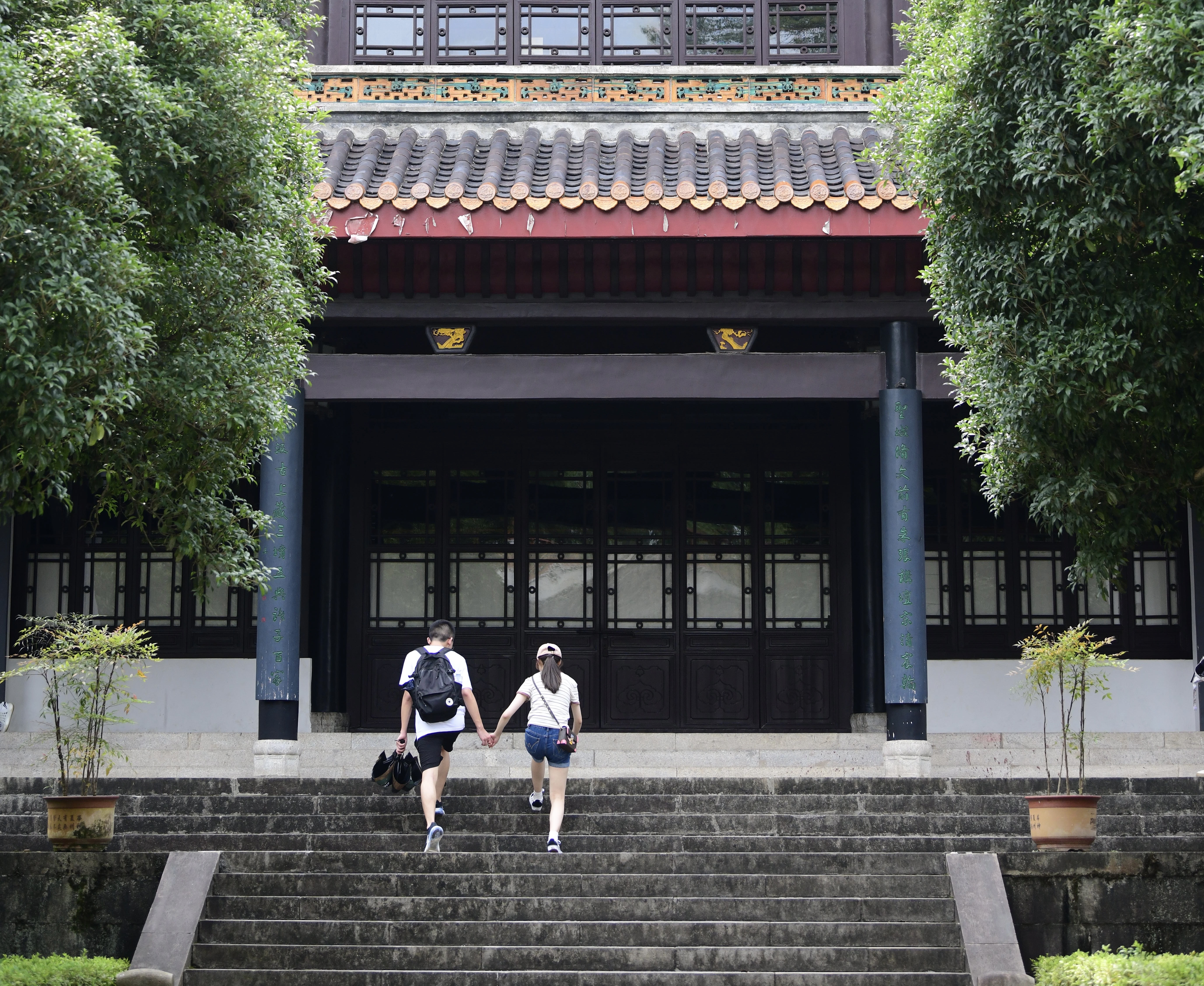 树梢泻下点点光影投在旧石砖上,37℃的长沙,似乎在这绿荫和凉亭间消解了几分暑意。“长沙的温度比我家直接高了十度左右。”来自内蒙古的韩同学表示,她和男友趁暑假出来旅行,长沙热辣的美食和美景给他们留下了太深刻的印象,“山上会比市区稍微凉快一点吧,我觉得做好功课后来岳麓书院会比较好,可以理解得更深刻”。