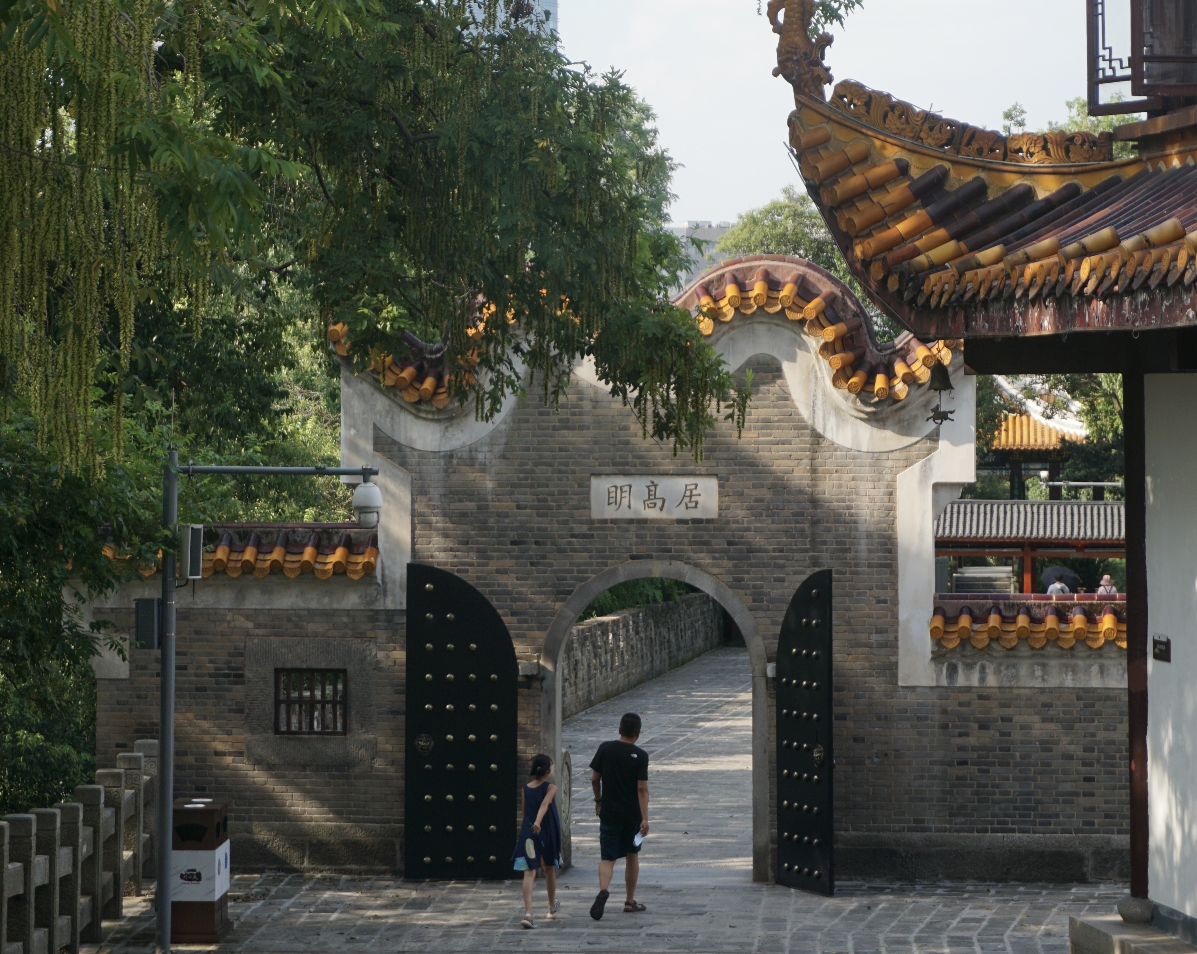 沿着石阶而上,穿过石门,古色古香的天心阁逐渐展现在眼前。下午4点,太阳的威力不减,主楼前的院坝被直直晒着,幸好有树林投下阴影,供游人们纳凉。