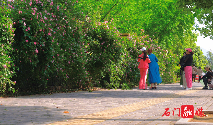 满园盛放的蔷薇引来游人驻足、打卡拍照。微风拂来,花香沁人心脾。