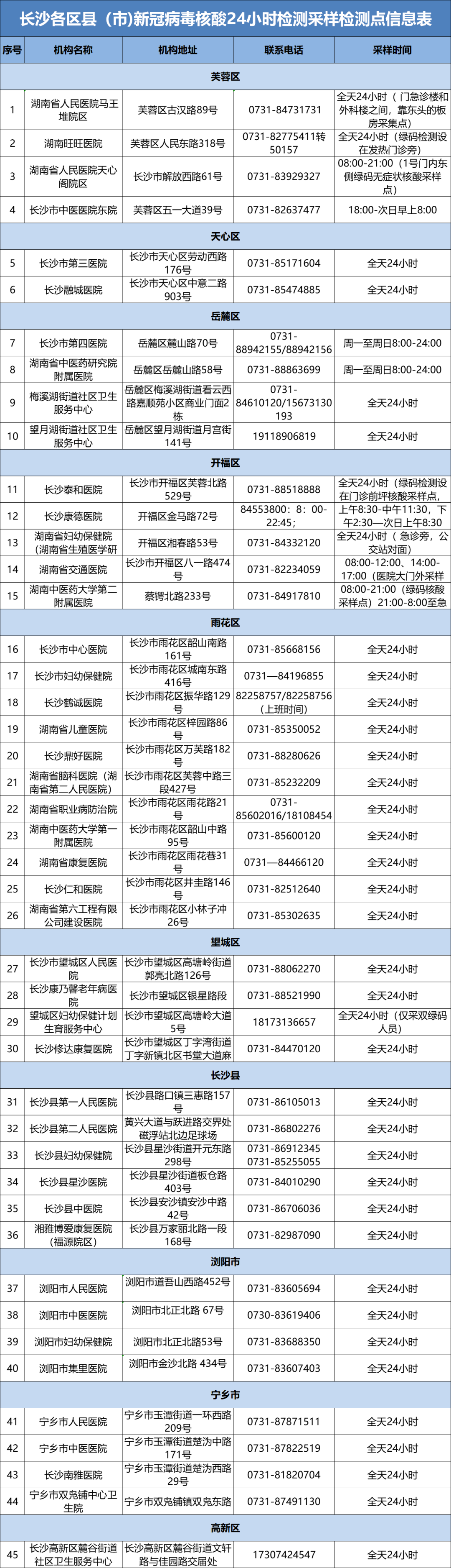 长沙各区县(市)新冠病毒核酸24小时采样检测点名单详见下方。