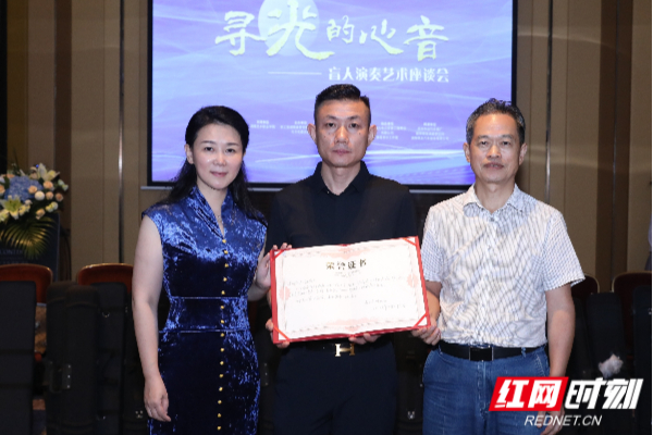 二胡演奏家李朋奇、竹笛演奏家毛镝、钢琴演奏家金元辉等盲人艺术家以及省会音乐界代表出席。会后,长沙市文联党组副书记谢胜文与座谈会组织者蔡霞老师共同为江苏丝竹乐器厂吕卫利颁发了捐赠证书,感谢该厂为李朋奇音乐会资助20把高档二胡。