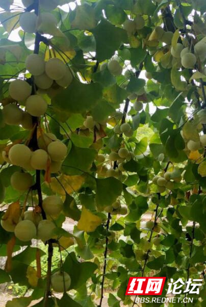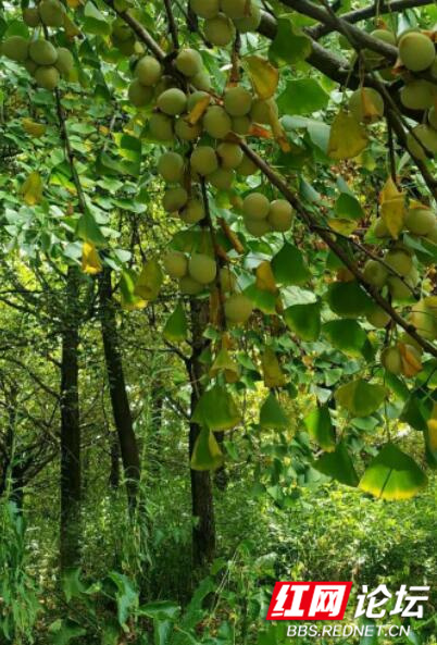 观赏银杏树一般以树叶黄时观赏为最佳时期,由于本人对这片银杏林的情感,到了桂阳就想着去看看,就像回到娘家放松心情一样,我觉得何时来观赏都是一样,在树林里就像投入母亲的怀抱。这次绿油油的银杏扇形叶下,带着串串白色的大银杏果,很是意外。城里长大的我根本不知植物生长规律,原来八月份就是银杏结果的季节。一位大妈路过,好奇的看着我们,还主动介绍说:银杏果可以吃的,但是有低毒不可生食,现在还没熟,再等一个月就熟了,然后摘下来晒干剥皮,里面的银杏仁是药材也是食材。银杏仁用来炖鸡吃,那就是美食一绝,吃了有滋补美容祛斑养颜的效果,女人的最爱。