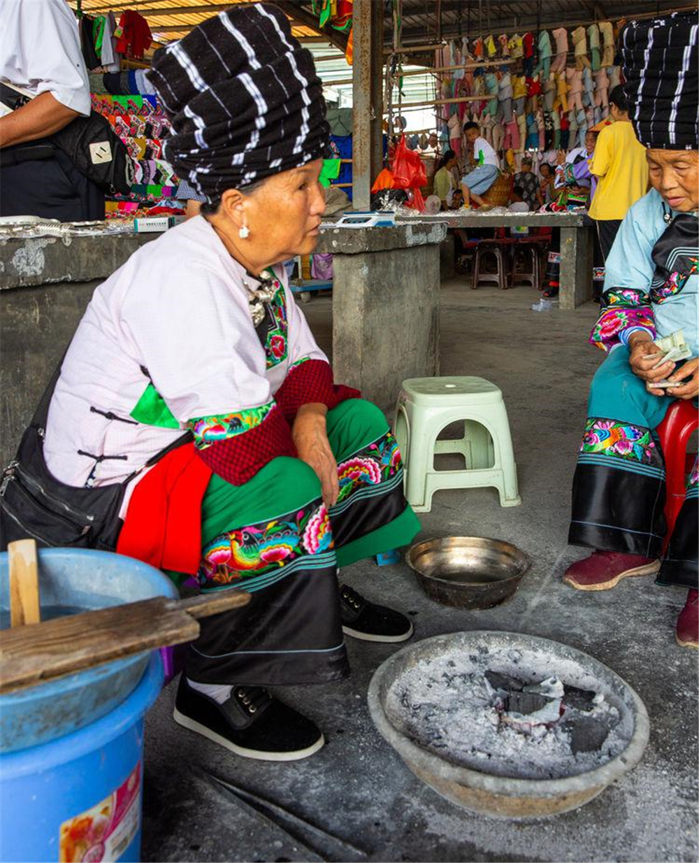 说到清洗银器是锻制银饰的最后一道工序,我七月底来到禾库镇"赶边边场",听老师说禾库赶场有一条"清洗银饰一条街",我多方打听找到那里。当我背着相机四处观望时,看到两个老妈妈围着一盆炭火正在清洗一件银饰品。我赶忙坐在她们面前,与她们有一搭没一搭地闲聊,将清洗银器的全过程拍摄下来。