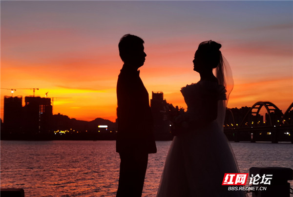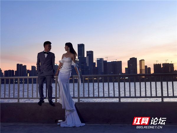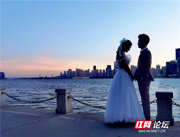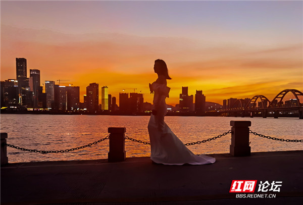 谁会拒绝在湘江风光带拍组好看的照片呢?毕竟这里的黄昏真的太美了,随随便便就能拍出一组浪漫又唯美的日落大片。正因为如此,越来越多的年轻人把湘江风光带作为拍摄婚纱照的最佳取景地,选择在日落黄昏的唯美时刻,倾听彼此爱的誓言。