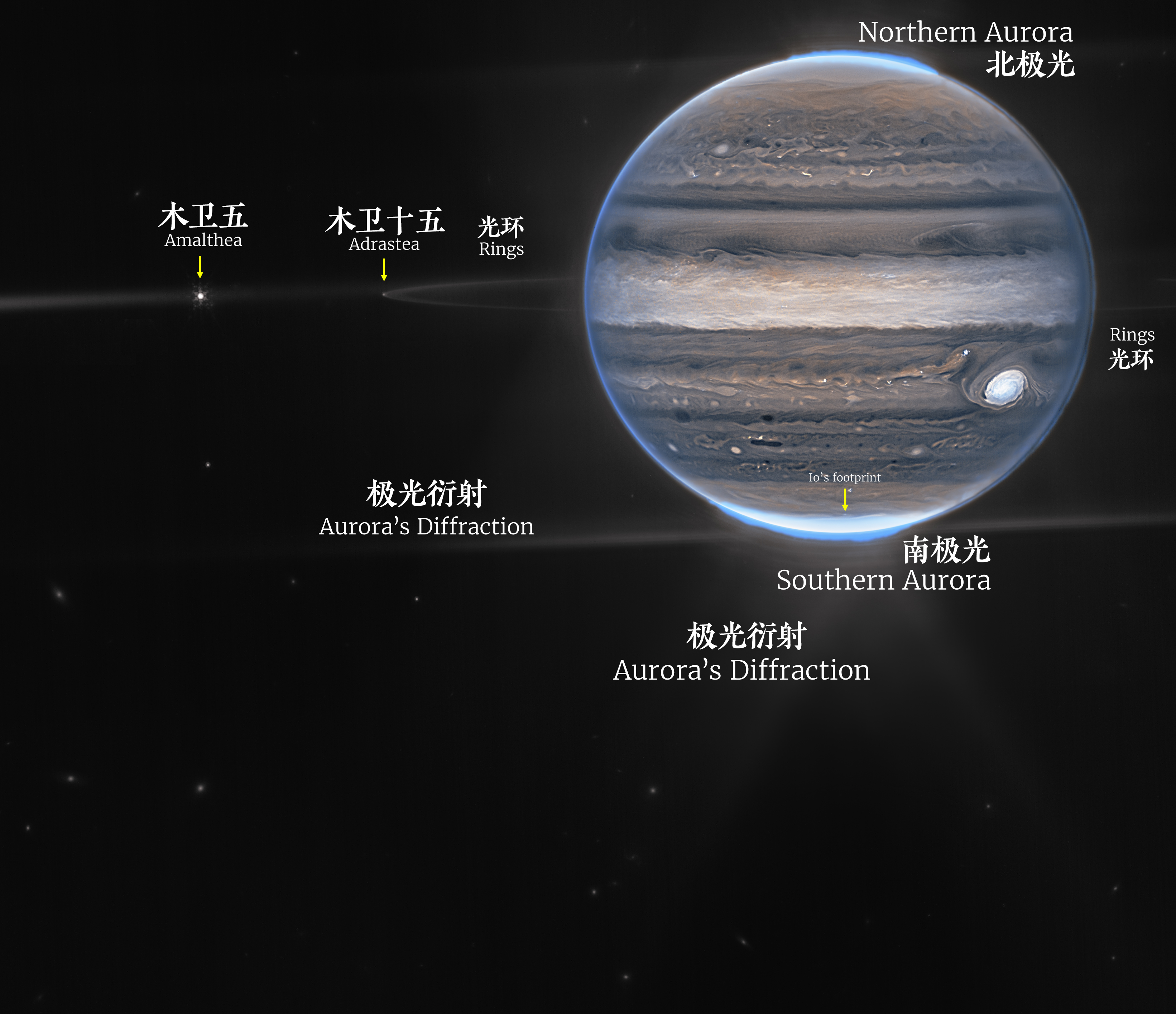 第二张照片是木星的广角照片,由2个红外滤镜拍摄合成。除了南北极光,还能看到木星周围微弱的光环,以及木星环左侧的木卫五(Amalthea)以及较暗淡的木卫十五(Adrastea)。照片下方的星星点点很可能是遥远的星系。