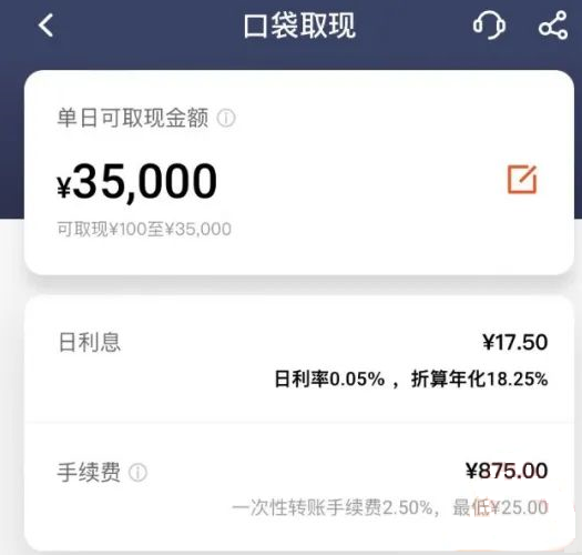 以平安银行信用卡为例,在支付宝的信用卡取现功能中,单月还提取的额度和利率,与平安银行旗下口袋银行APP中“口袋取现”单日可提取金额和利率相同,都是日息万分之5,年化18.25%,这意味着平安银行只是在支付宝上多开了一个端口。就目前情况而言,信用卡取现扮演的是一个助贷平台的角色。