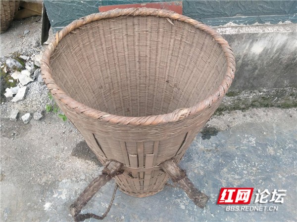 另一种装松针或松果之类的,形如斗笠,长度比斗笠长很多,上口宽大,下口狭小,深有八十多公分,像极了男人的啤酒肚。里面装松针用脚采紧后到上口边缘处,就把松针堆积成金字塔似的小山包,上面再扎一根木棒,走崎岖的山路时防止松针坍塌下来。