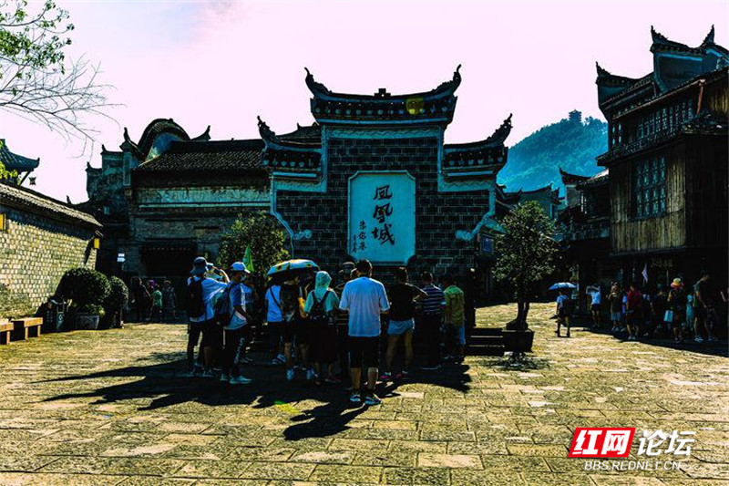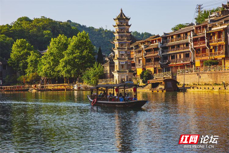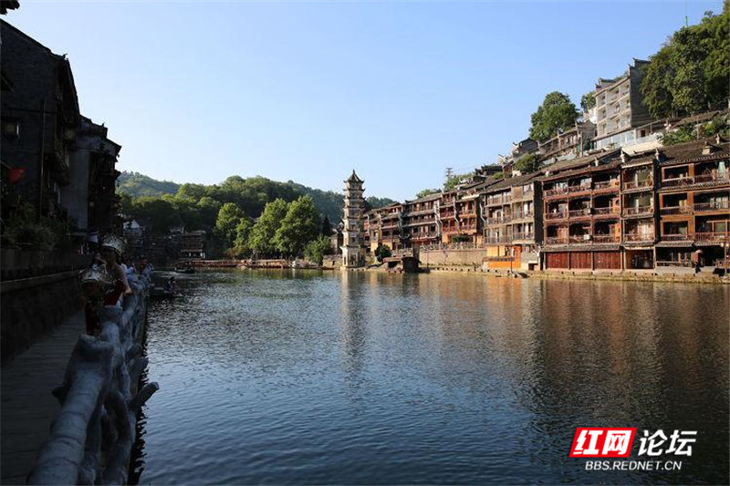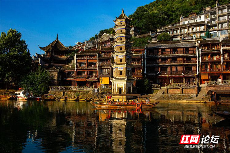 凤凰古城的山郁郁葱葱,给古城人民带来欢乐与祥和;凤凰古城的沱江水真美,太阳光照在水面上,水面上浮现出五彩斑斓的波纹。凤凰古城的宝塔别具一格,塔身挺拔秀丽,宛若少女亭亭玉立于沱江之畔。塔身映入沱江碧波之中,摇摇晃晃,显得格外秀气动人。