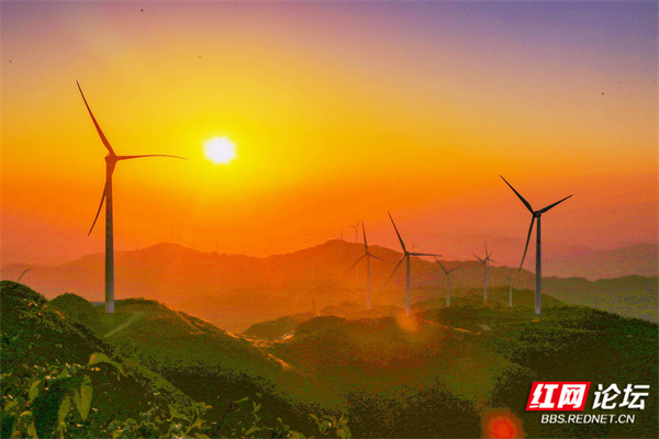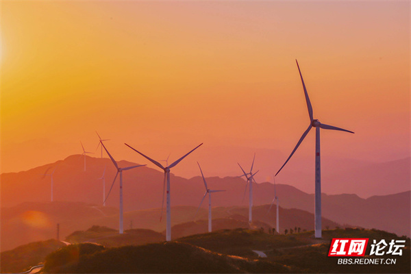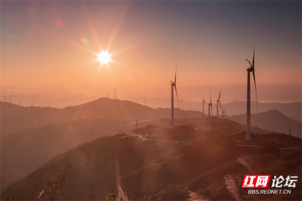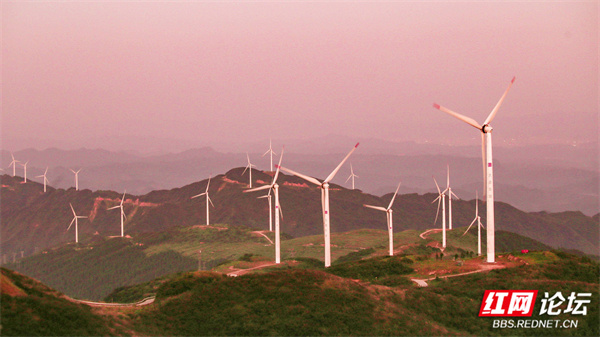 上西晃山的村公路弯多坡陡,我们的车在西晃山盘山公路上慢慢行驶,车子转了一个弯,看到了西晃山顶露出几台白色风车,车子越往上开,风车离我们越近,风力发电机就显得更加高大,威猛挺拔,顶天立地。不一会儿,我们到了山顶,小车在一台风机下停下来。大家把风车围起来,我们围了4人才把这硕大的风车围住。我抬头向上看,风力发电机顶上有三片叶轮,每片叶轮长43米,风力发电机高45米,重45吨多,白天的风不是很大,风轮慢慢地自然地转动着。一台台风力发电机在群山中巍然屹立,宛如山中的哨兵,深情地站岗放哨,守护着自己的地盘,又像永不停留的时钟匀速转动着。