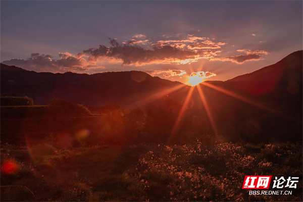 接近傍晚,太阳快要下山了,西边的天空没有一点云彩,却出现一片火红的天空,显得格外地漂亮好看,这夕阳就像一名化妆师,把刚刚还是灰蓝的天刹那间变成了彤红的天,刚刚满天的白云一下子变成了火红的晚霞,西边那连绵不断的群山也被夕阳下淡淡的山雾笼罩上一层昏红的面纱。山谷中那一抹芦苇,那一座座院落,也被柔和的夕阳染得金光。还有茫茫白雾和万道金光,把西边天空染得格外美丽。
