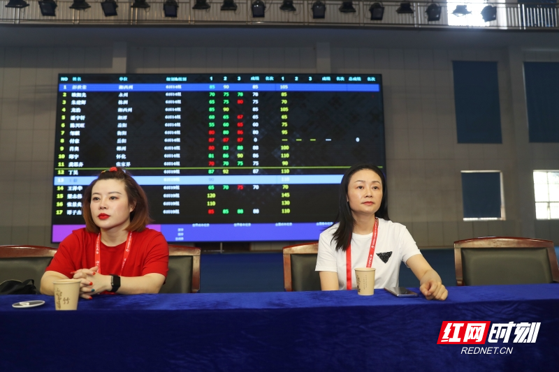 举重奥运冠军、湖南省举重运动管理中心副主任王明娟(左),湖南省举重运动管理中心副主任樊绮(右)在现场观赛。