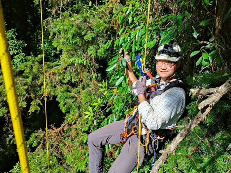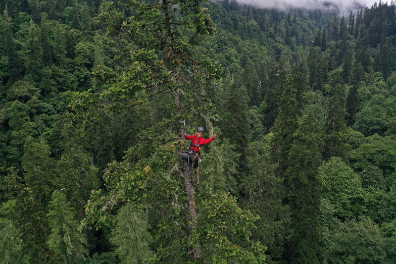 攀树直接测量与无人机辅助结合调查巨树,科考队员、中科院植物研究所博士研究生王孜拍摄。