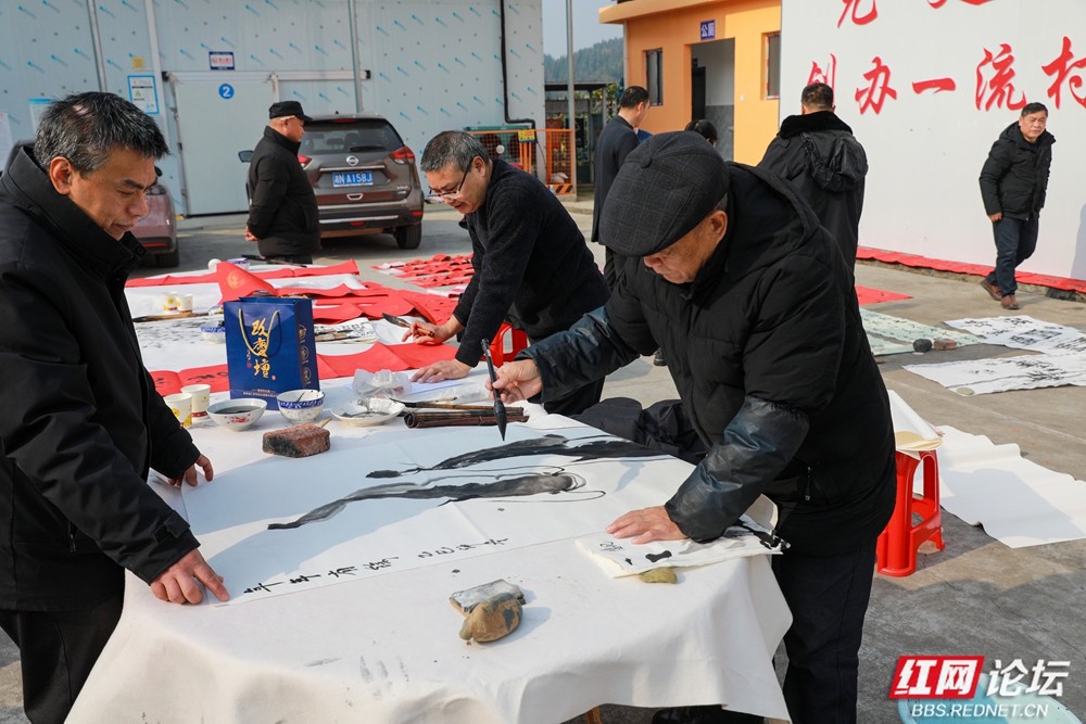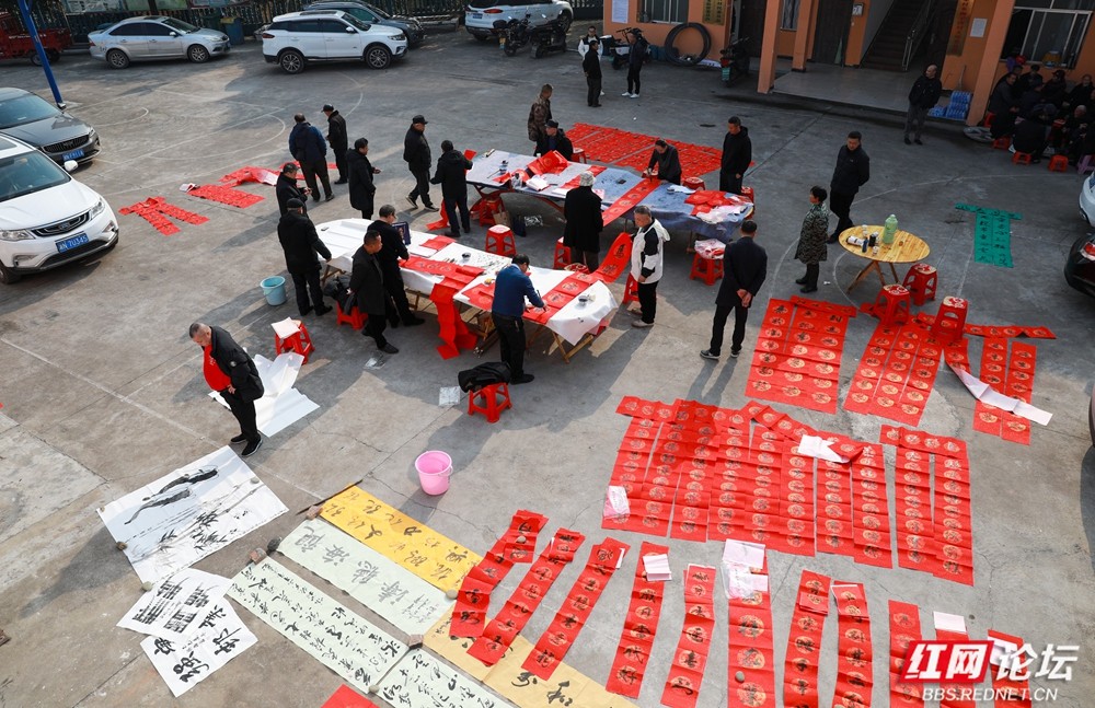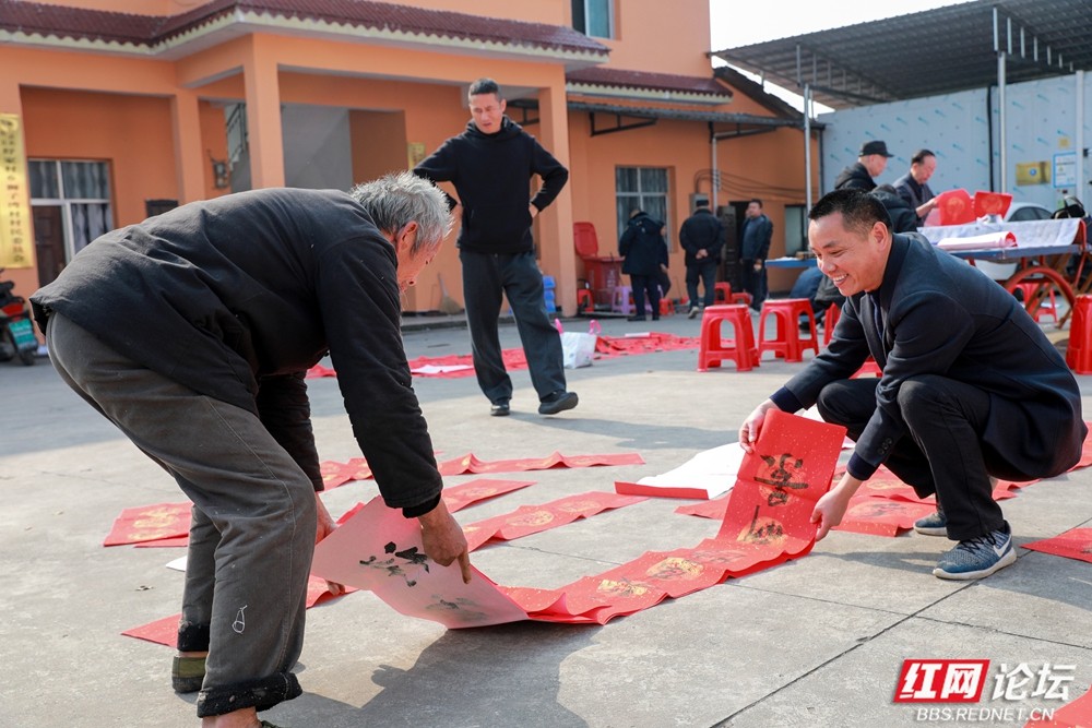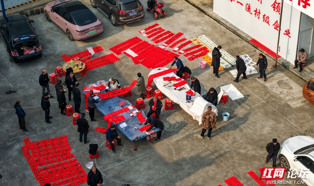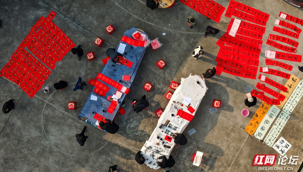 活动现场,来自麻阳县教育局关工委的书画爱好者们挥毫泼墨,将对新春的祈愿凝结于笔端。随着毛笔起落,一副副充满喜气的春联、一张张苍劲有力的“福”字跃然纸上。最引人注目的是,近百副鲜红的春联在广场上整齐铺开晾晒,从空中俯瞰,宛如在村部大院铺就了一层喜庆的“红地毯”,与村民们的笑脸交相辉映,勾勒出一幅和美乡村的新春画卷。(图文/滕树明)