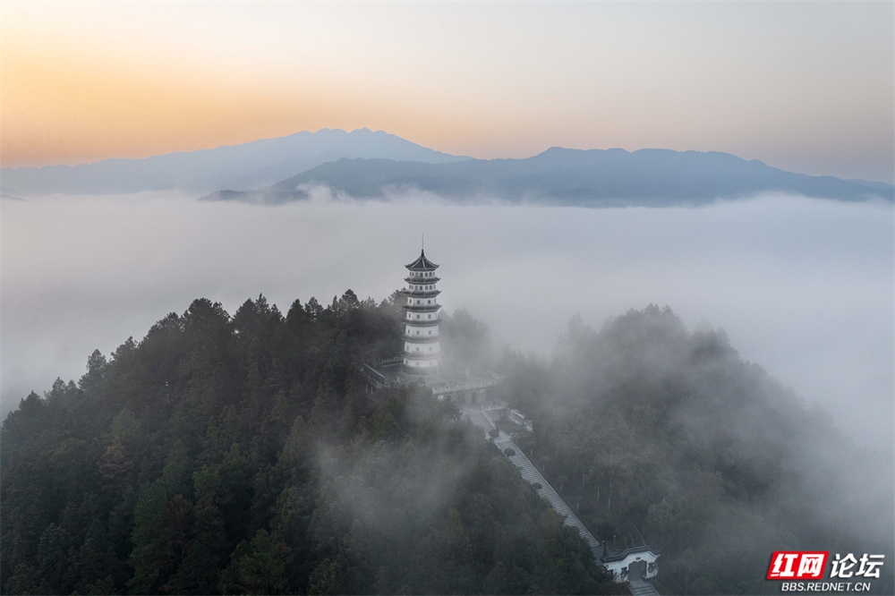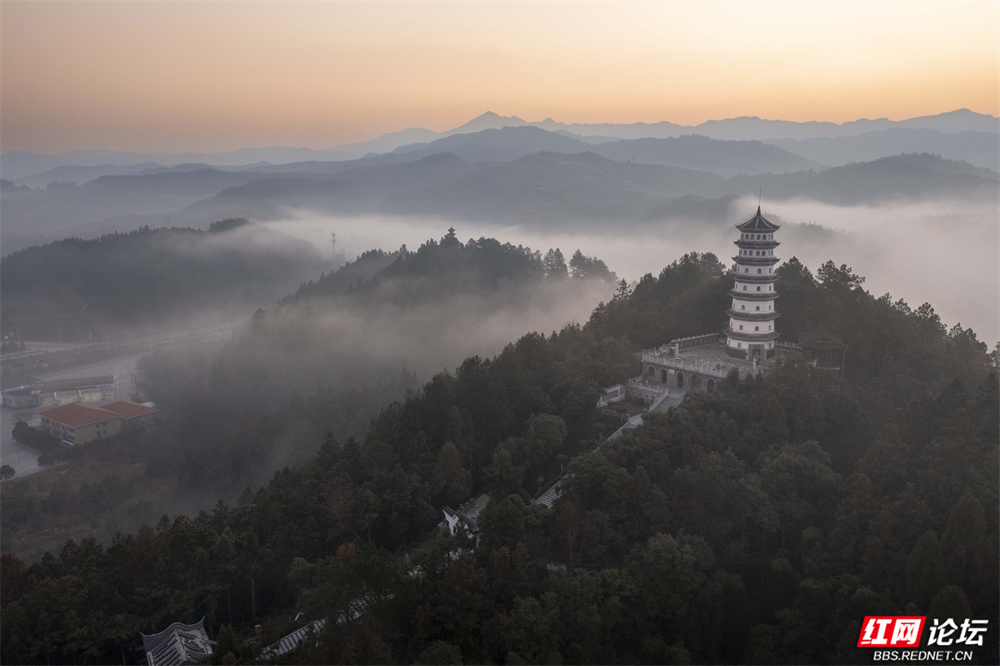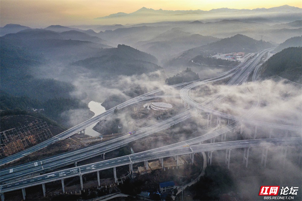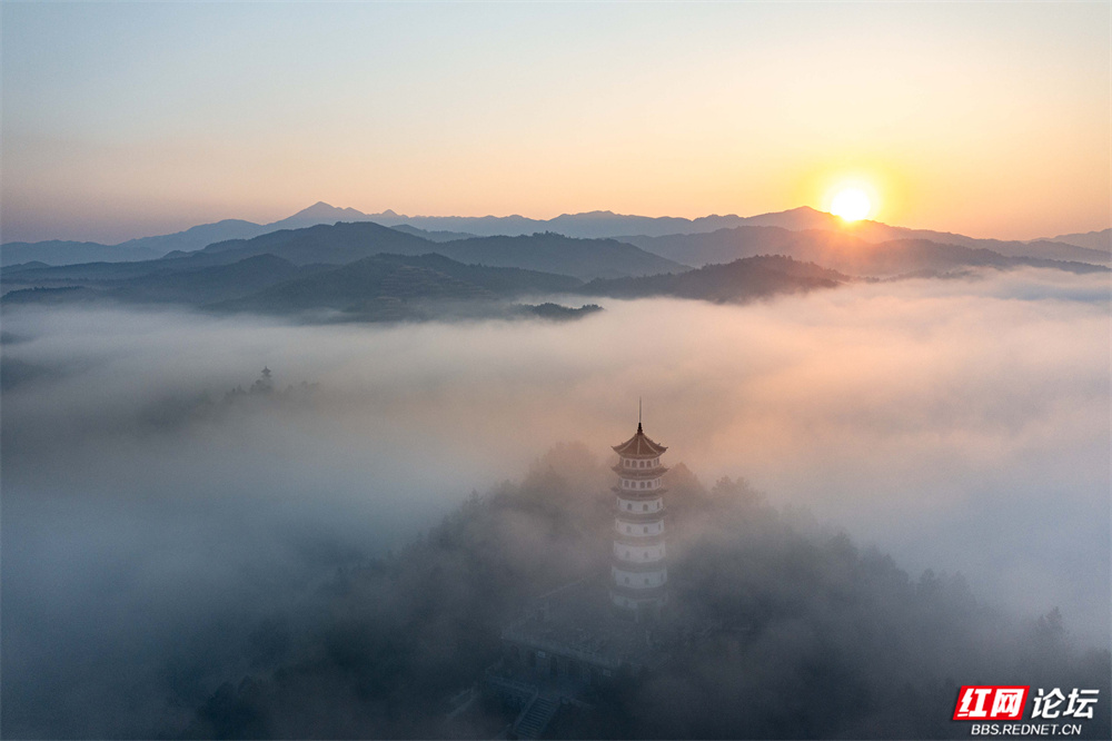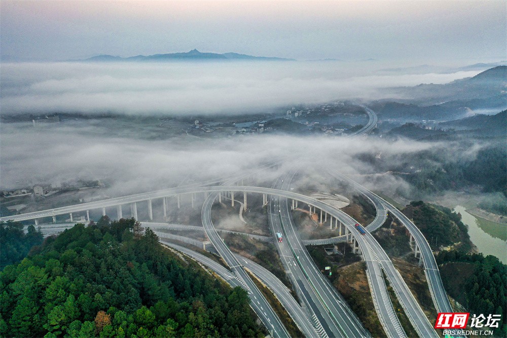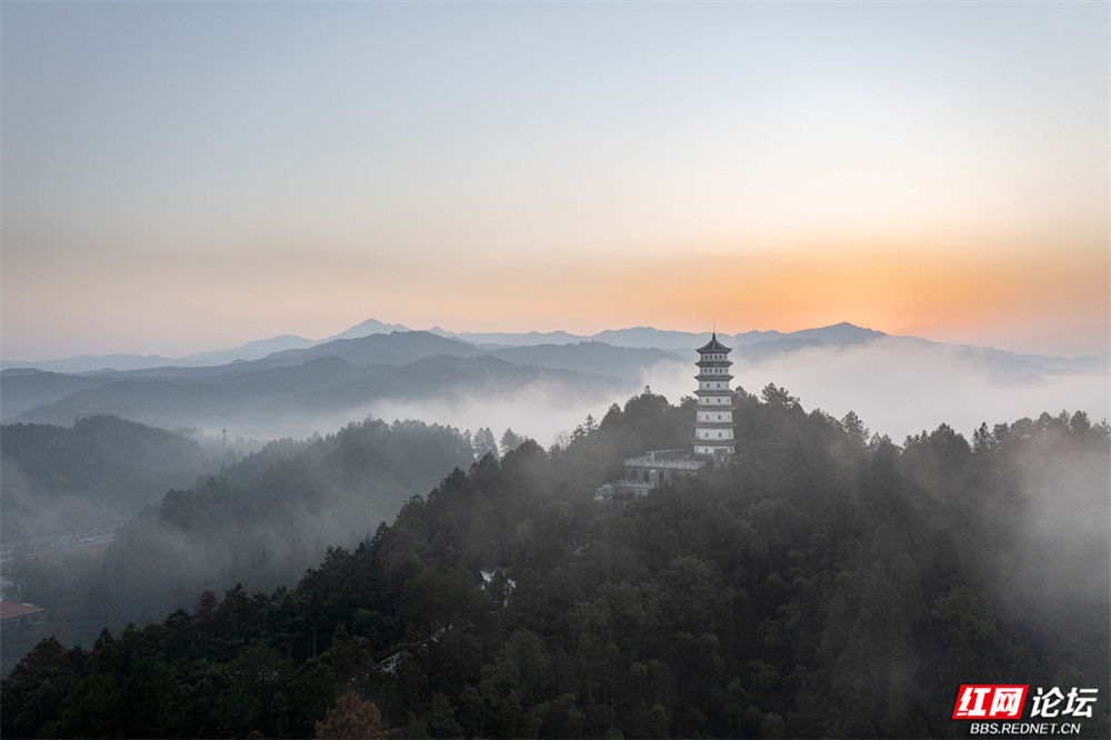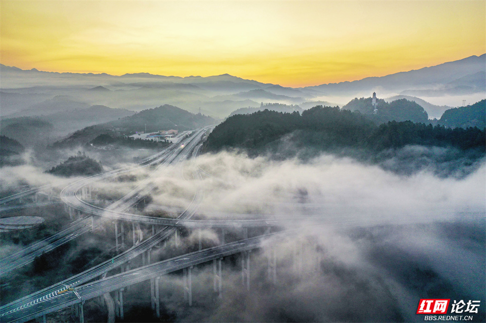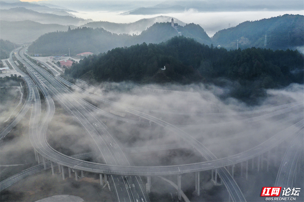 靖州苗族侗族自治县文峰塔景区近日迎来冬日晨雾。山间云海翻涌,如轻纱缭绕,古朴的文峰塔矗立其间,宛若“浮”于云端的一颗明珠。远处,高速公路蜿蜒穿梭,桥隧交错,在缥缈的云海中若隐若现。现代交通动脉与千年苗乡的人文地标遥相呼应,彼此映衬,共同勾勒出一幅既充满诗意又生机盎然的靖州山水画卷。(图文/许志国)