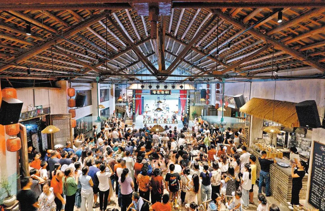 茶馆内的陈设保持着旧日风貌,重现了过去以农耕和家庭为核心的日常生活图景。尽管去年九月才开业,但地道的茶饮、本地特色菜肴和现场演出,让消费者流连忘返。每逢花鼓戏开演,总是最受顾客们的欢迎。