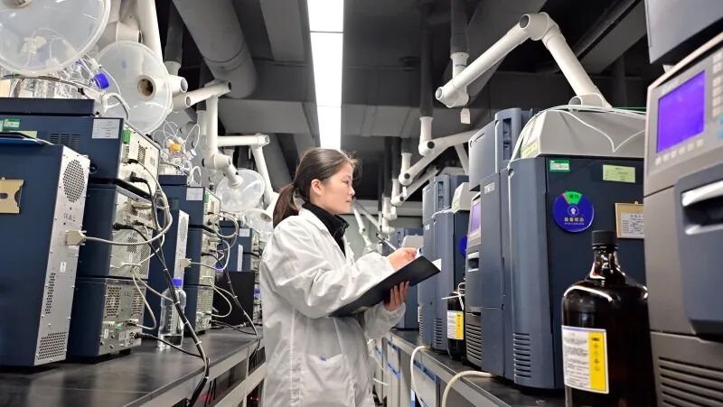 华纳大药厂实验室内,科研人员正在操作仪器设备。