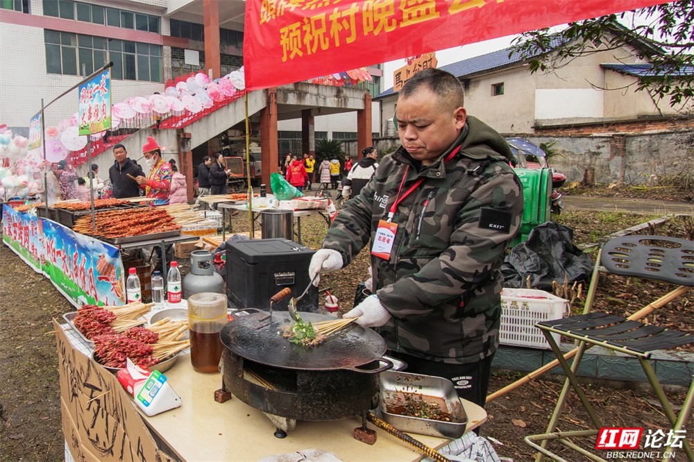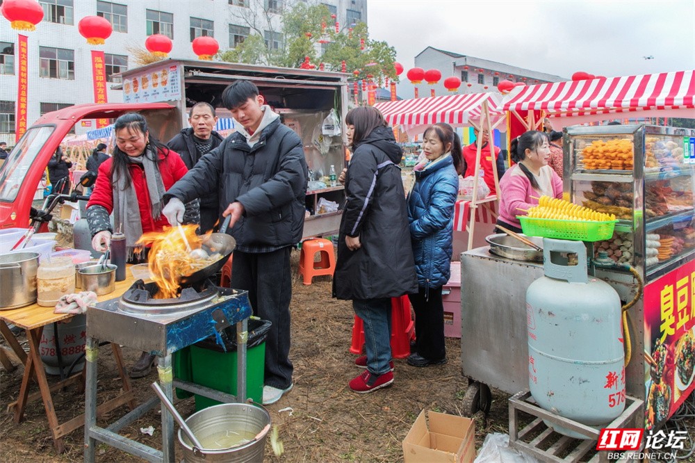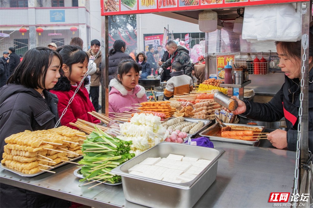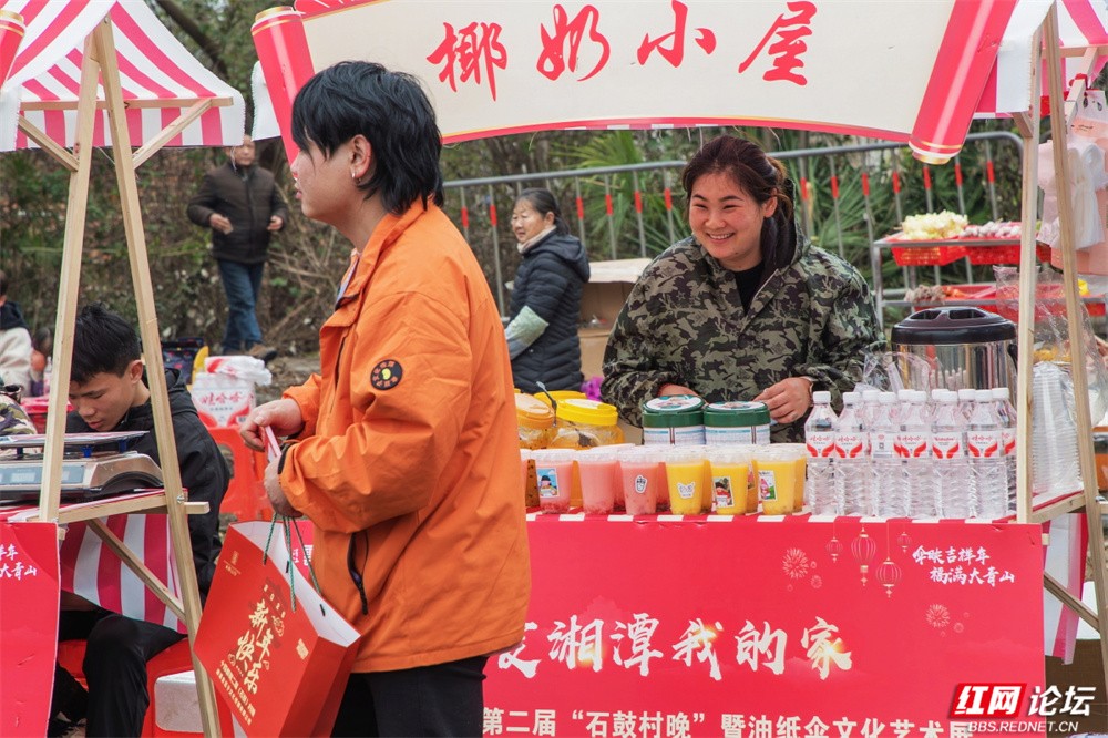 2026年的“石鼓村晚”暨油纸伞文化艺术展还没开演,旁边的年货集市已经热火朝天。油锅里的火焰滋滋作响,琳琅满目的小吃串成了喜庆的红色,摊主大姐脸上的笑容比红灯笼更灿烂。这就是我们要的春节:有美食暖胃,有欢笑暖心,更有这扑面而来、热气腾腾的人间烟火气。(图文/谭学文)