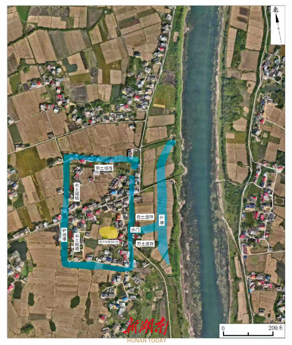 考古队由此确认:城址所在区域为涟水河口,其西侧、南侧为涟水,东侧为湘江。城址四周环壕完整,环壕内南北长约330米,东西长约360米,环壕内面积约104000至118800平方米。这些特征与楚汉时期湖南地区同类遗存的特征相符。