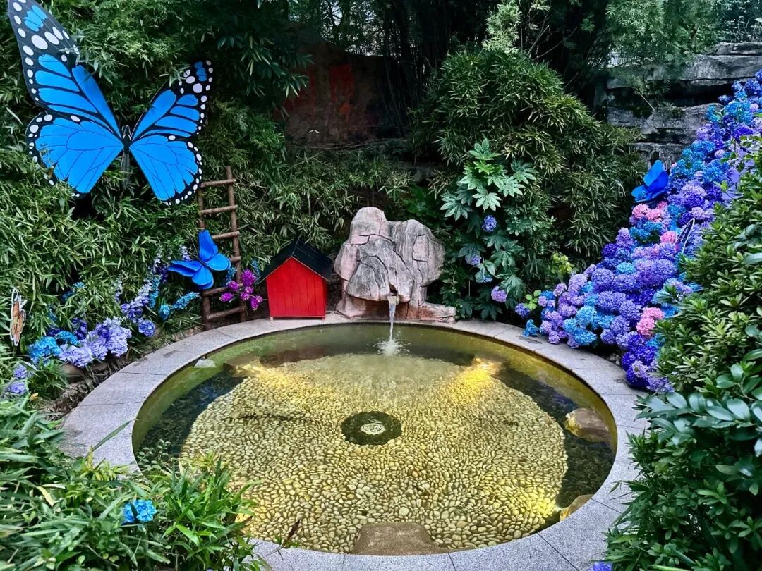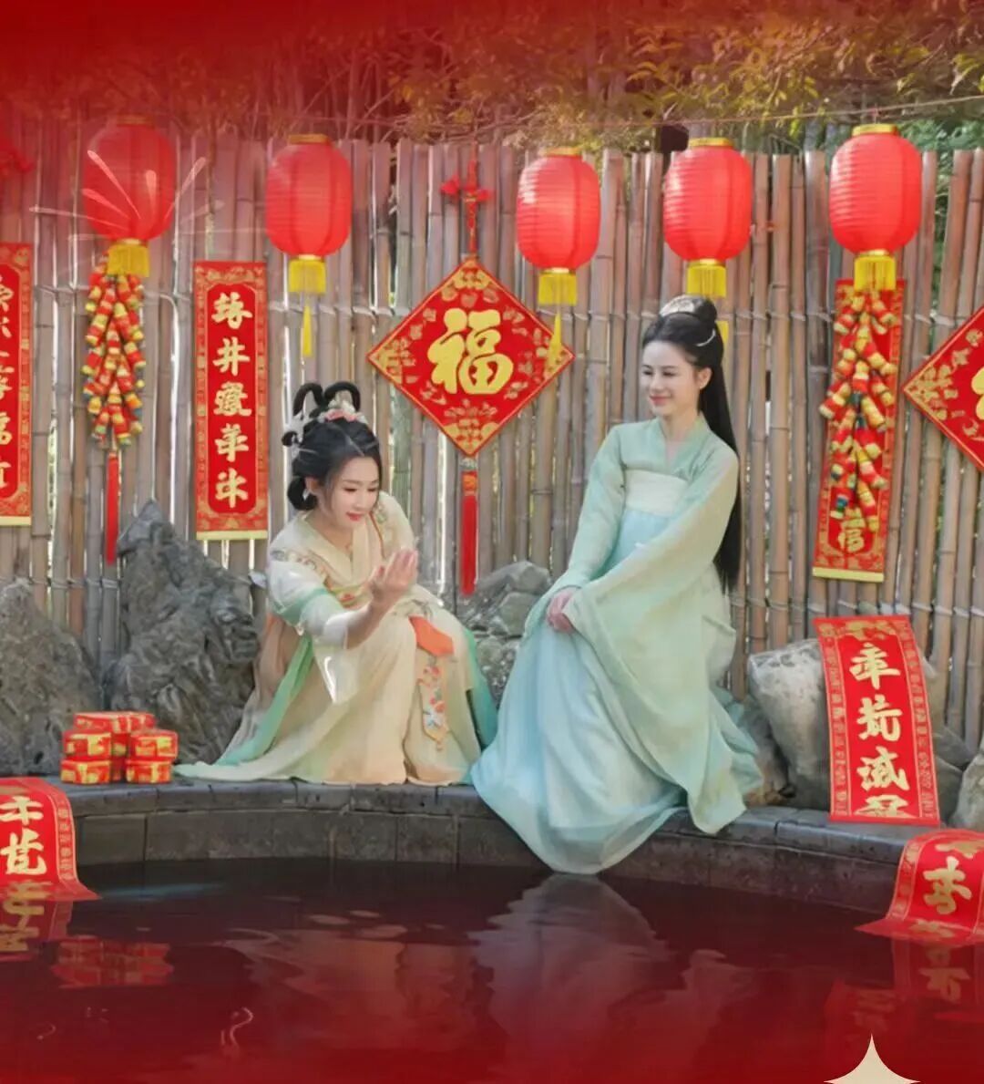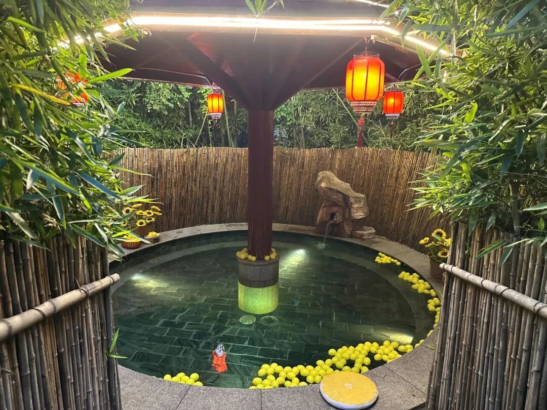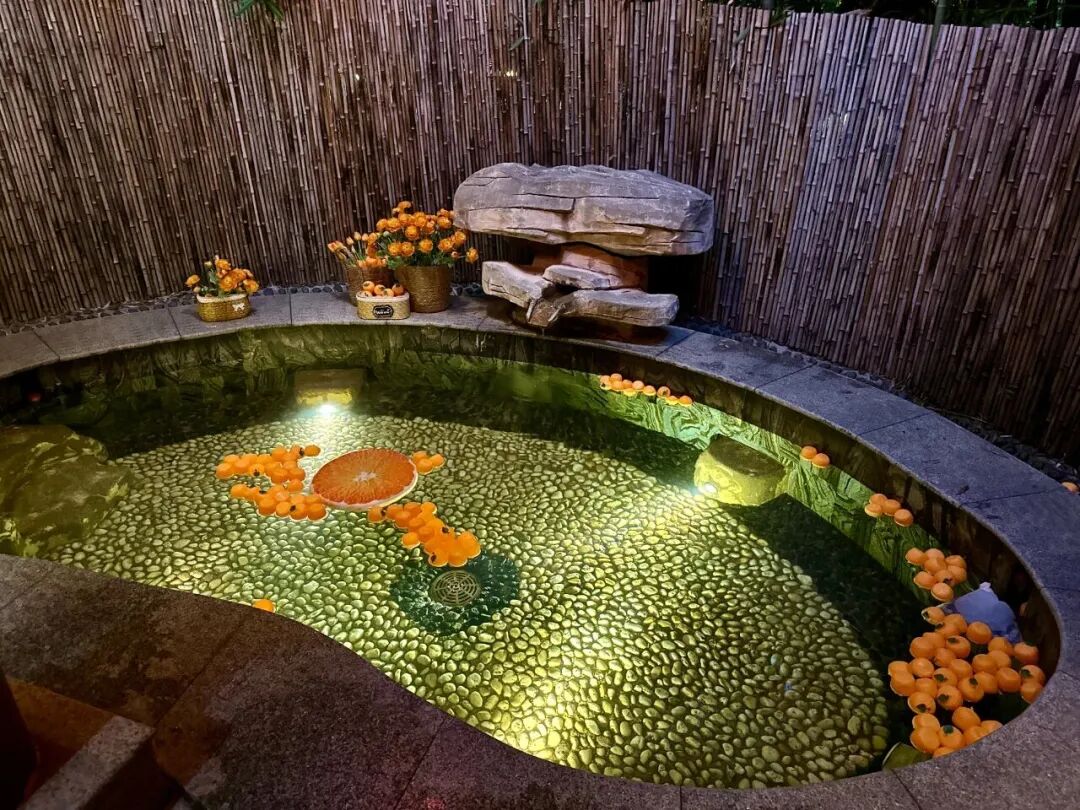 温泉中心特设新春温泉“添福池”,融入新春元素及天然草本香料,寓意泡去旧岁、喜迎福运。池边布置红灯笼、福字装饰,营造喜庆祥和的泡汤氛围。