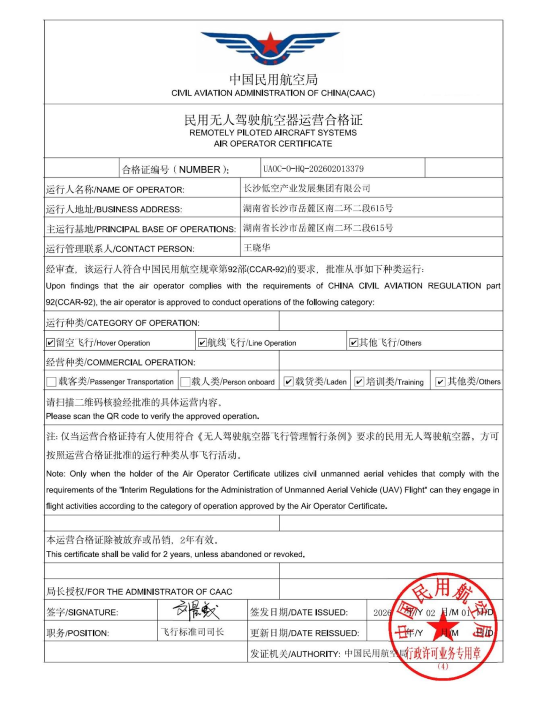 CAAC民用无人驾驶航空器运营合格证经国家民航主管部门多维度严格审查。此次长沙低空集团成功获证,被明确批准开展留空飞行、航线飞行等多类运行活动,可开展载货、培训等经营业务,为应用场景落地、业务拓展筑牢根基。