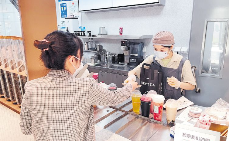 ▲在长沙泊富广场的一家奶茶店内,顾客正在取餐。(范宏欢/摄)