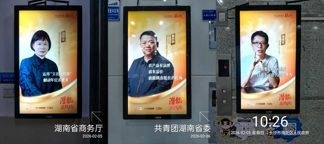 ▲红网千屏联播网电梯小屏上滚动呈现《潜能实践论》系列报道的海报。