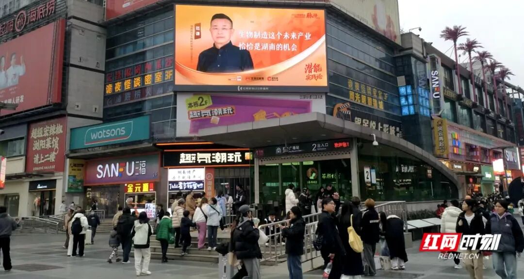 ▲长沙黄兴路步行街等核心商圈户外大屏上,滚动播放《潜能实践论》系列报道的海报。