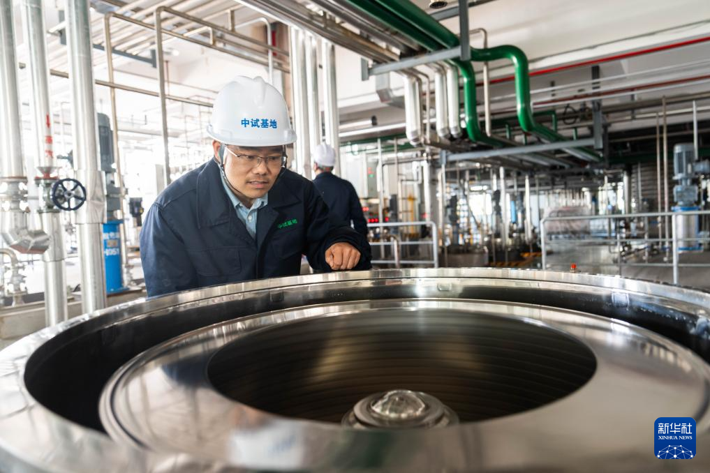 ▲津市高新区内的湖南生物制造中试基地发酵液提纯车间,工作人员使用平板离心机进行物料脱水作业。(图源:新华社)