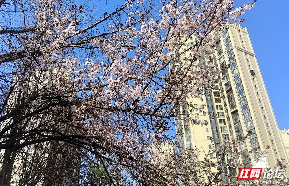 我驻足树下,看那盛开的花朵围成一圈,在阳光下绽放笑脸,娇艳动人;有的还只是花骨朵儿,一串串缀在枝头,宛如粉色的珍珠。凑近观瞧,五片轻盈的花瓣包裹着细长的花蕊,蕊头顶着点点金黄,引得蜜蜂闻风而动,忙着采撷花粉与春蜜。