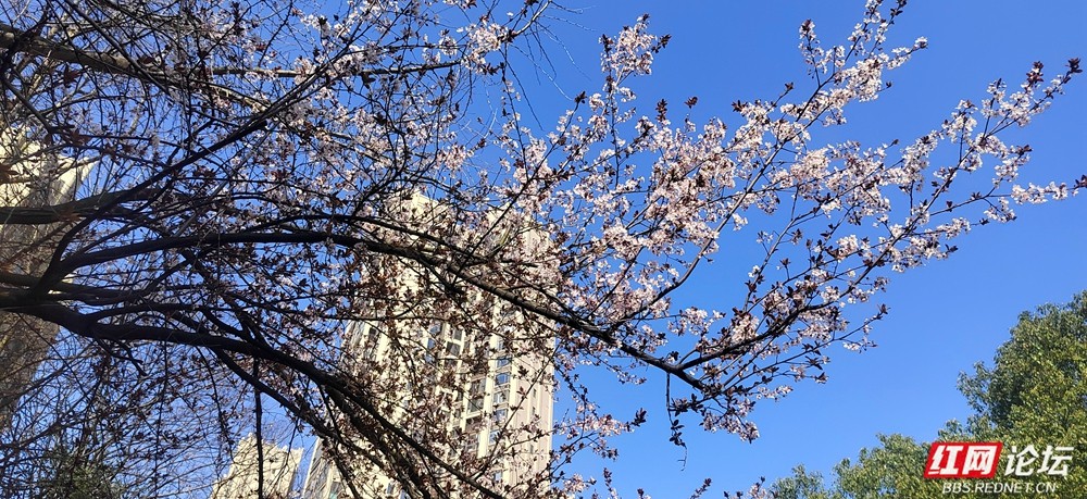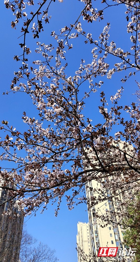 小区里遍植红叶李,这几日信步其间,尚未见花,便有一股清雅的幽香先声夺人,撞个满怀。抬头望去,繁花已占枝头,远看如片片绯红的轻云,在春光里报喜。确实,红叶李是院子里最早感知春意的使者。