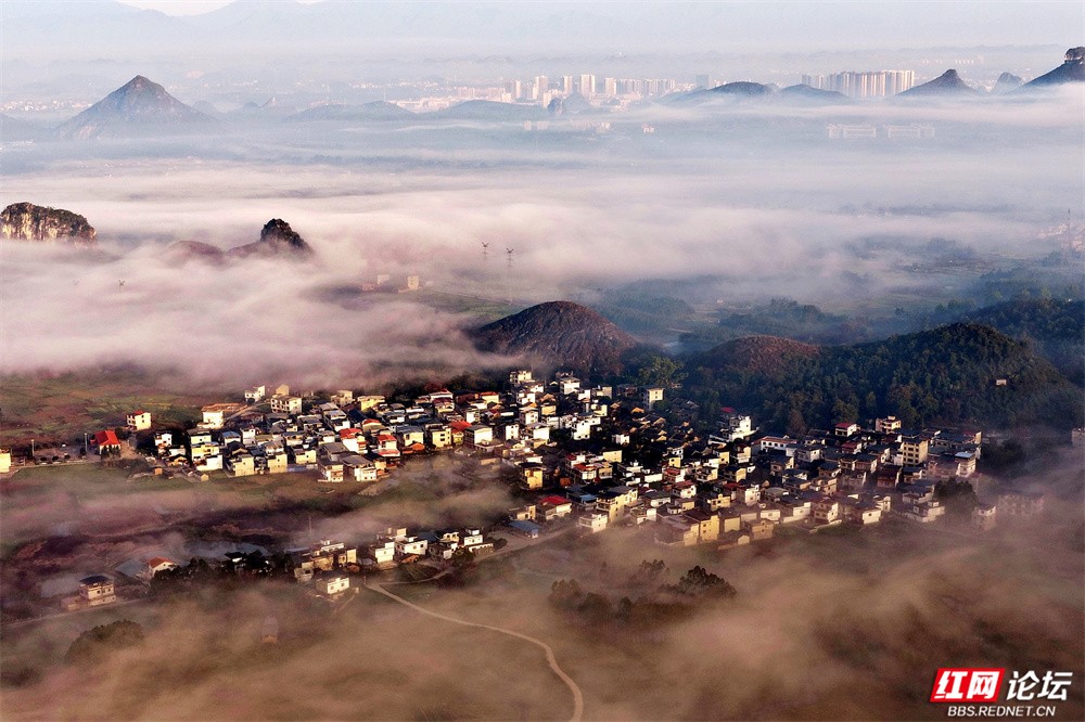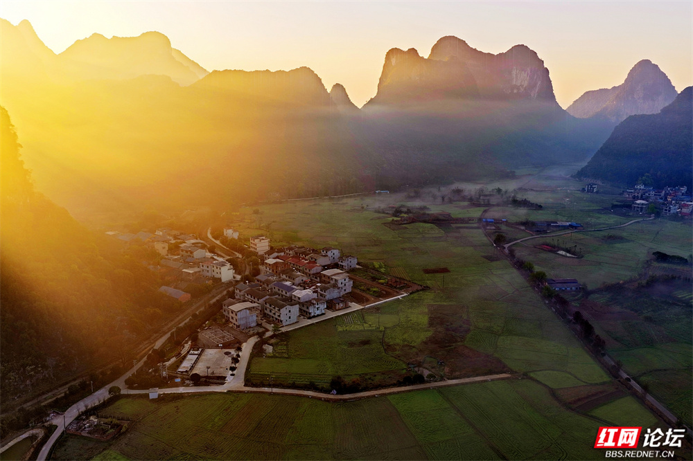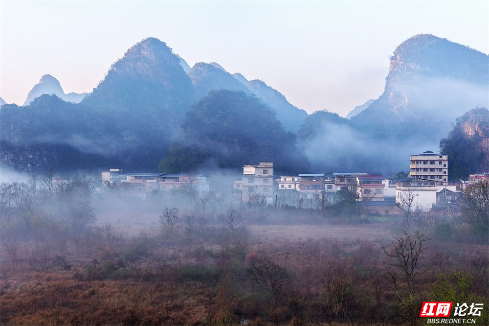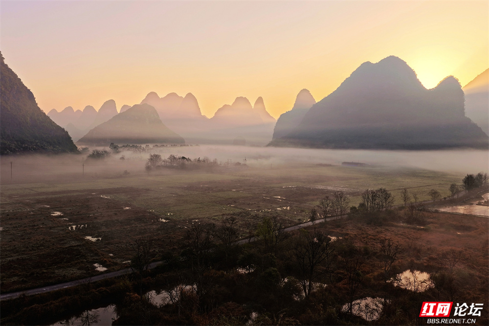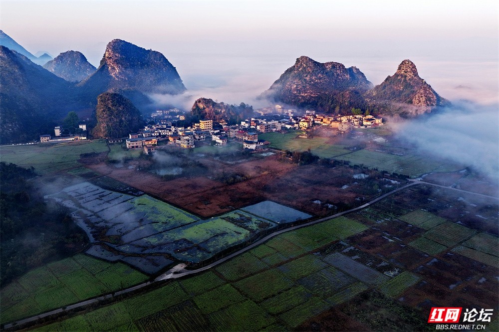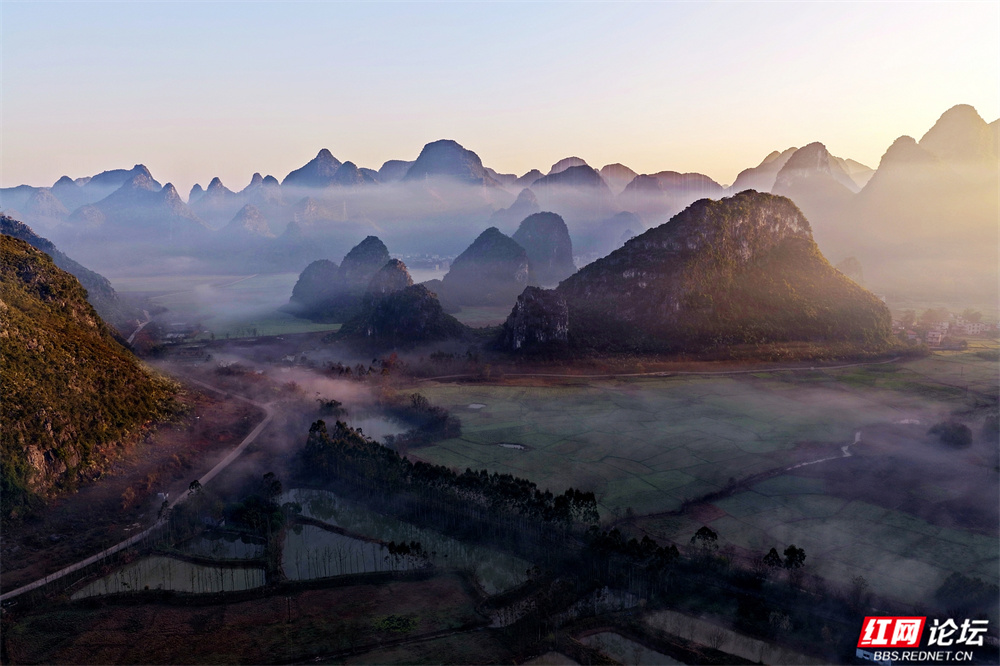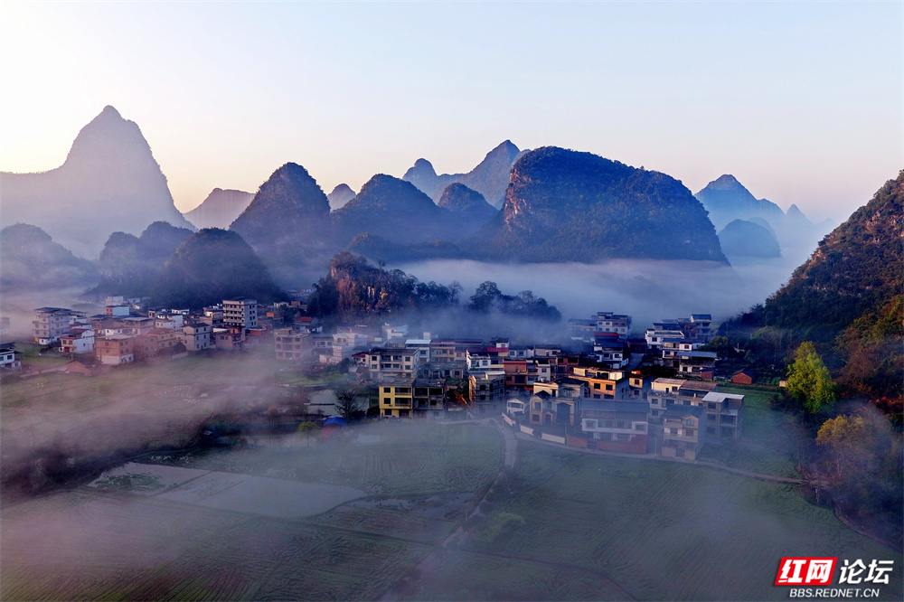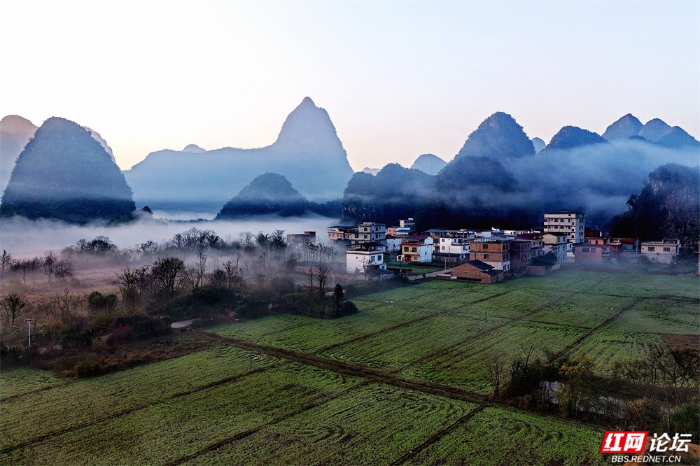 晨雾如轻纱拂过喀斯特峰林,四塘镇在熹微中缓缓苏醒。错落的屋舍枕着山峦的轮廓,田野在薄霭间舒展成静谧的诗行——这里是桂林临桂的清晨,一幅被自然眷顾的水墨长卷。