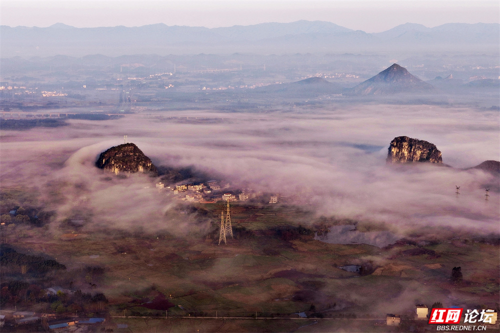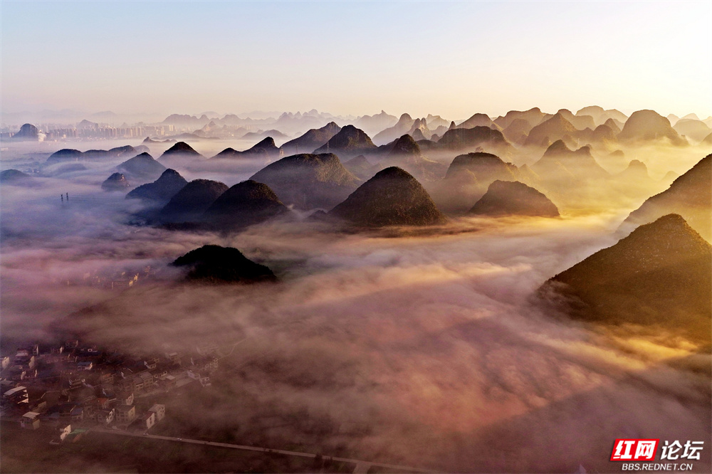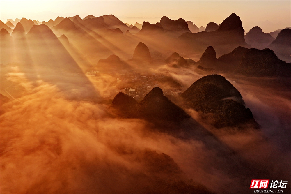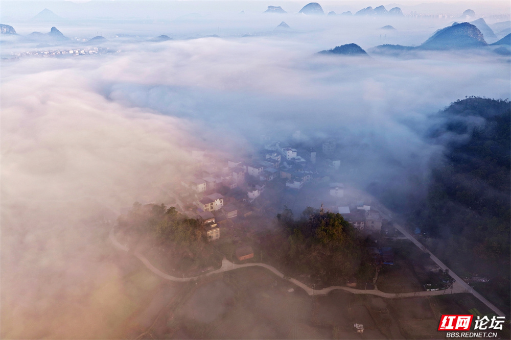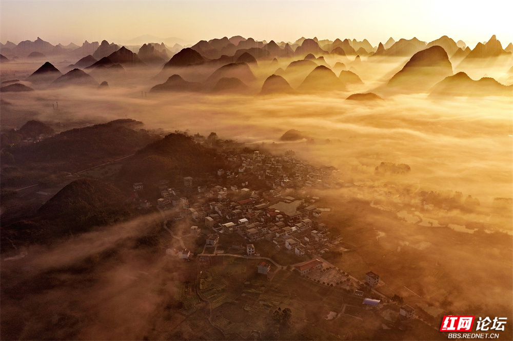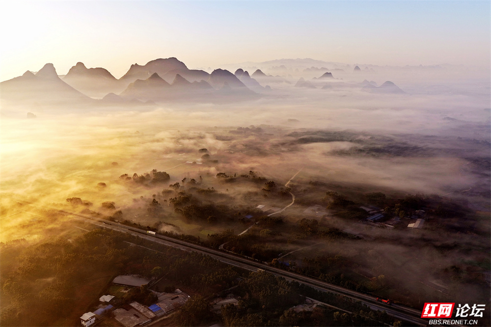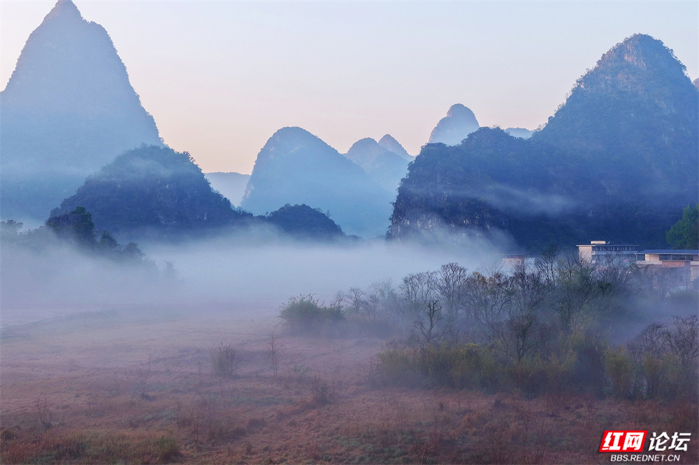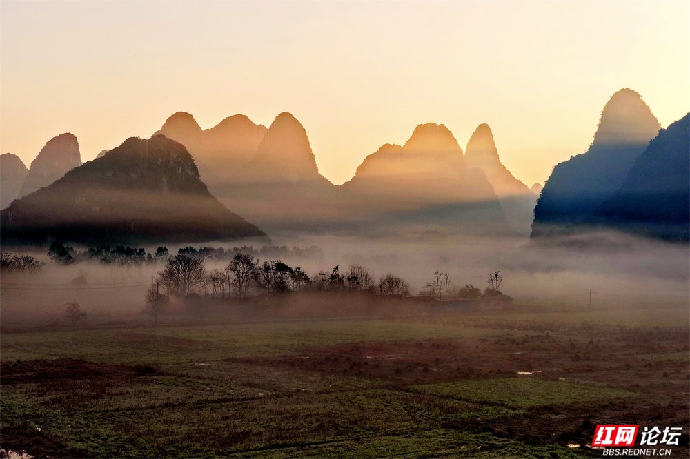 晨雾如轻纱拂过喀斯特峰林,四塘镇在熹微中缓缓苏醒。错落的屋舍枕着山峦的轮廓,田野在薄霭间舒展成静谧的诗行——这里是桂林临桂的清晨,一幅被自然眷顾的水墨长卷。