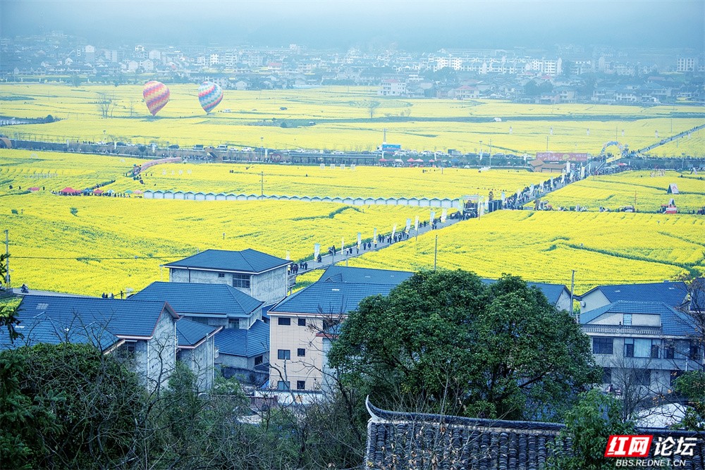 答案藏在这片金色海洋里——稻香诗田的油菜花,从脚下漫向远山。花田立着诗意的标语,风车与热气球点缀天际,远山村落静卧雾中。