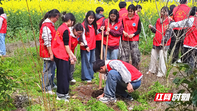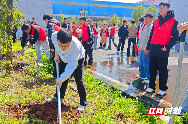 该校的绿色行动不止于校内。3月12日当天,校团委携手共青团蒸湘区委,奔赴校外联点区域,联合开展了2026年蒸湘区“‘植’此青绿,共‘树’未来”主题义务植树志愿活动。活动现场,青年学子们热情高涨,在更广阔的土地上挥洒汗水。他们不仅用双手为大地播撒新绿,更将课堂所学的生态文明理念播撒向社会,以实践行动诠释了新时代青年的社会责任与担当,让“爱绿植绿护绿”的文明新风吹遍街头巷尾。