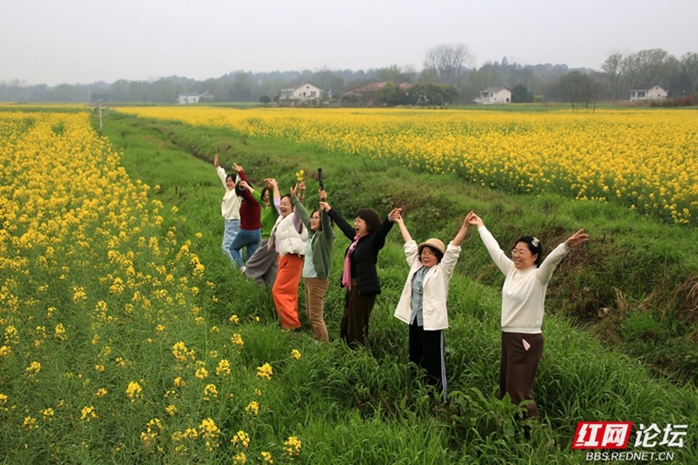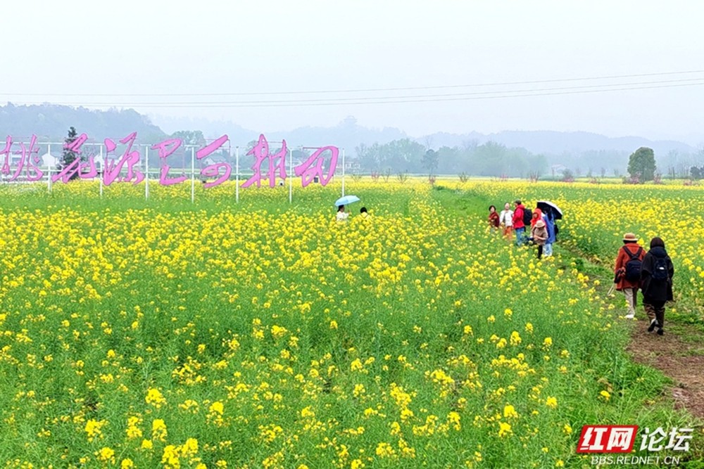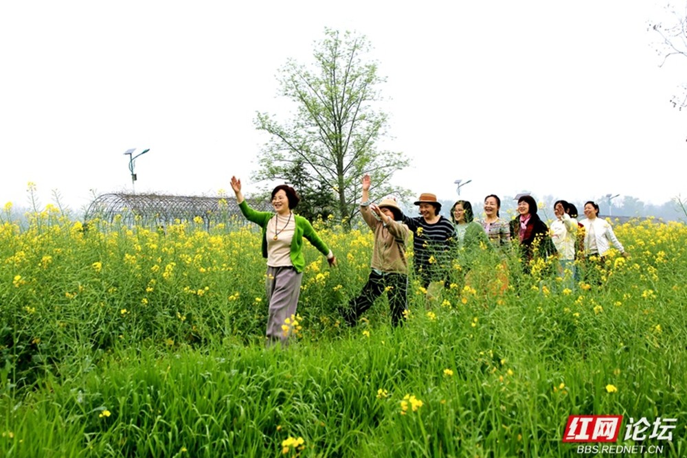 众人搭乘渡船,在轻烟散入五湖枪的朦胧中横渡沅江。江面波光粼粼,远山如黛,水乡的温润扑面而来。登岸瞬间,满目金黄的油菜花海铺展而开,与远处“桃花源里可耕田”的标牌相映成趣。会员们漫步花径,陶醉在“满筐圆实骊珠滑,一朵芳馨蜡泪干”的田园诗意中,纷纷定格下这如画的春色。