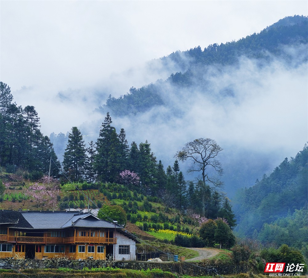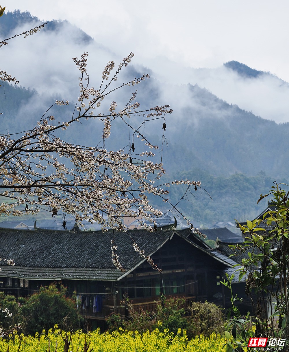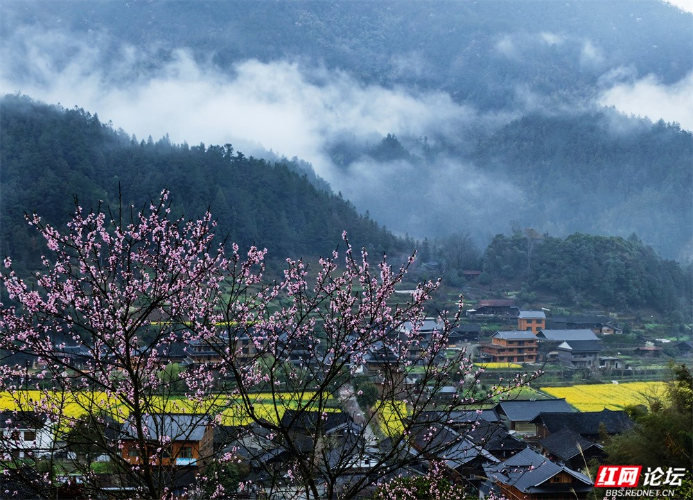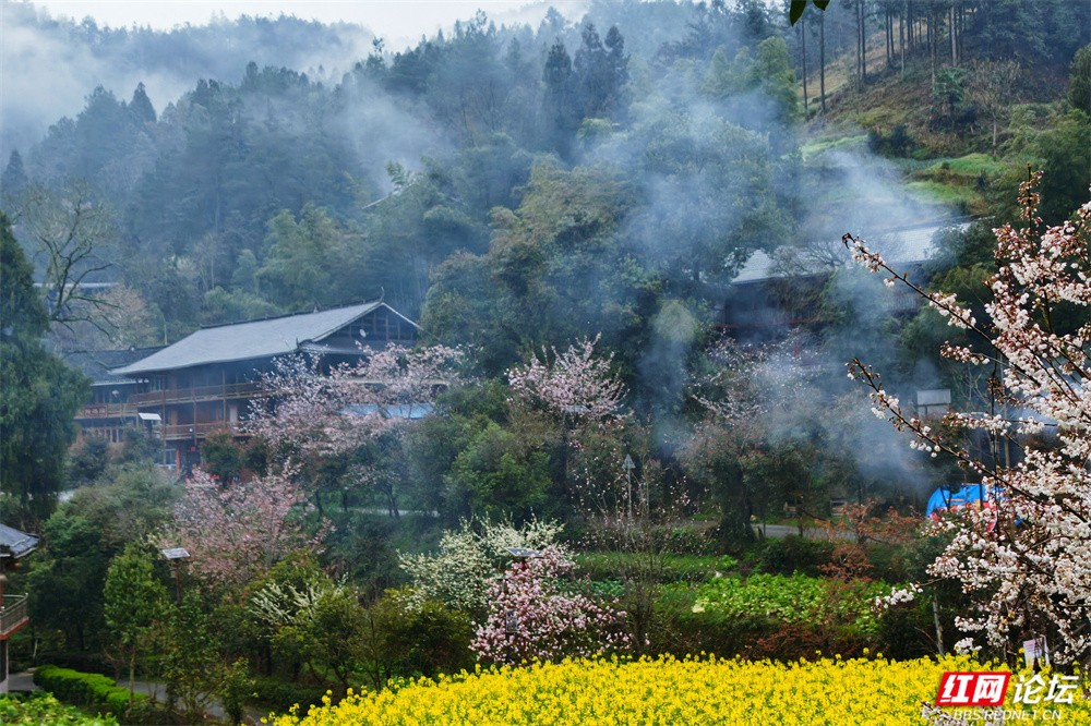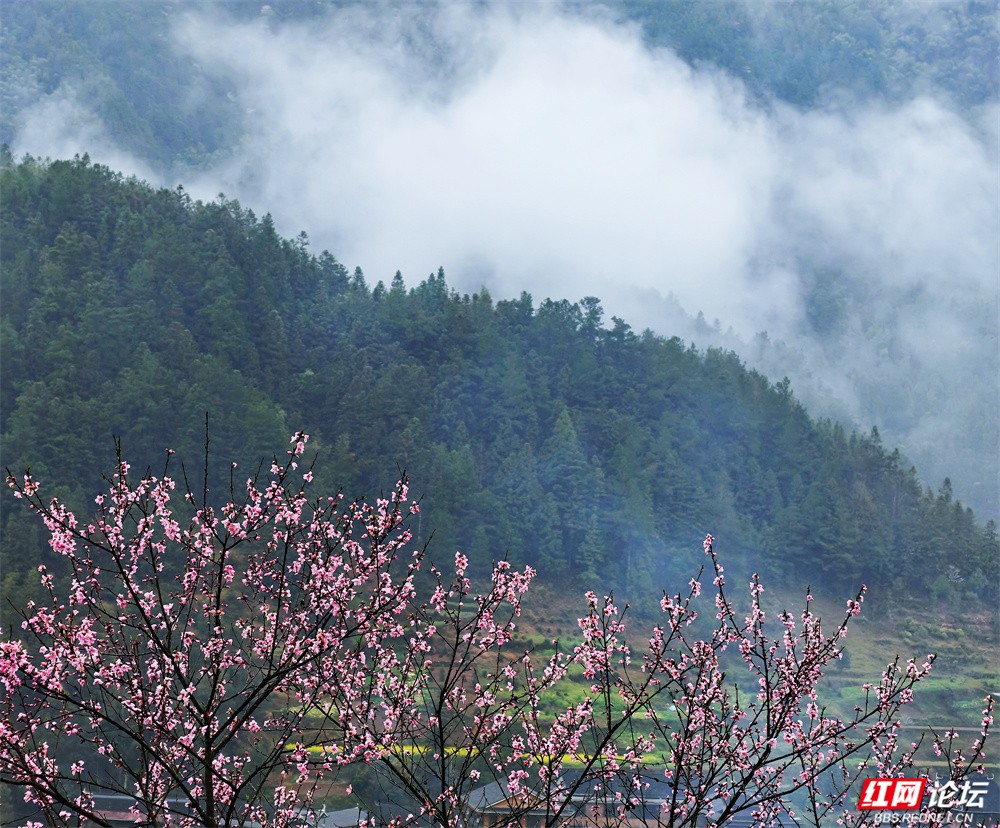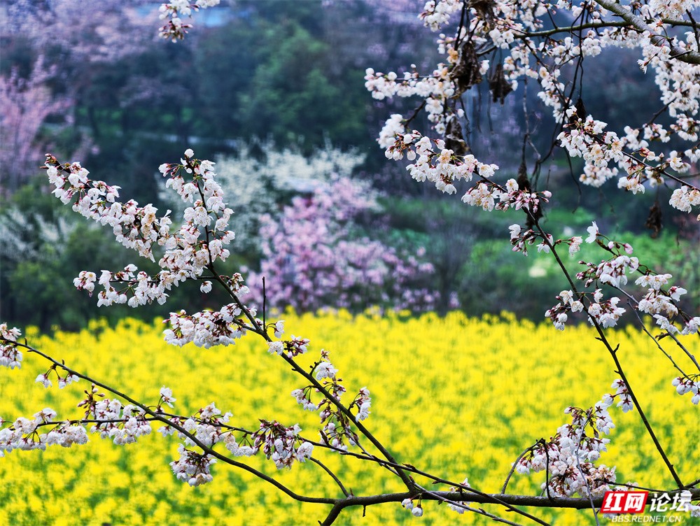 金黄的油菜花沿坡漫开,宛如一席流淌的鎏金绒毯,覆盖着起伏的田畴;粉艳的桃花缀满枝头,灼灼其华,似轻绯云霞缠绕林间;洁白的梨花素雅亭亭,如枝头新雪,清丽动人。樱花浅粉莹白,随风摇曳,姿态温婉;玉兰则高立枝梢,展瓣如盏,气质端雅。各色花姿在此交织,色彩层叠晕染,花香随山风弥漫,与远处青霭缭绕的峰峦相映成画,共同勾勒出这幅令人沉醉的春日山景。(图文/新化县摄影协会 方建宏 张建新 伍湘红 袁平)