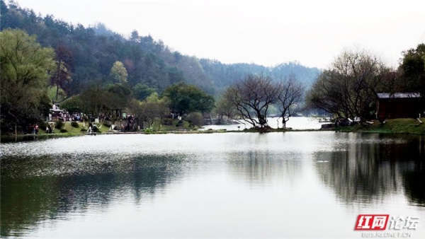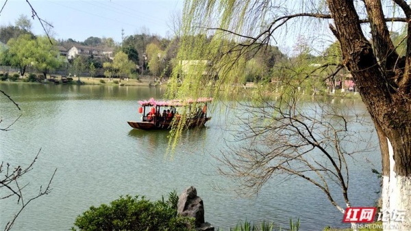 行至五柳湖畔,又是一番别样景致。湖水澄澈如镜,倒映着蓝天、白云、桃花与古建;岸畔陋室青瓦,亭台雅致,尽显江南园林的婉约之美。春风拂过湖面,波光粼粼,落花漂浮,与水中云影相映成趣。漫步湖畔,看游人笑语盈盈,听风过林梢;品一碗清香四溢的桃花源擂茶,佐以特色小吃,唇齿间留香,心底尽是温润。这方水土孕育的烟火滋味,是桃花源独有的温柔。